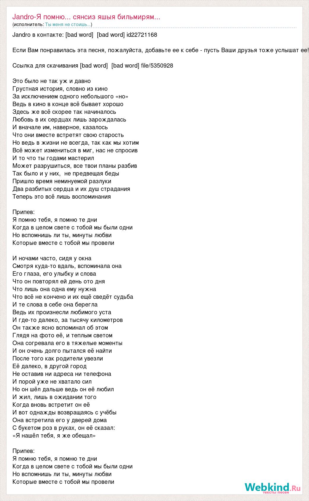 Jandro в контакте: [bad word] [bad word] id22721168 Если Вам понравилась эта песня, пожалуйста, добавьте ее к себе - пусть Ваши друзья тоже услышат ее! Ссылка для скачивания [bad word] [bad word] file/5350928 Это было не так уж и давно Грустная история, словно из кино За исключением одного небольшого «но» Ведь в кино в конце всё бывает хорошо Здесь же всё скорее так начиналось Любовь в их сердцах лишь зарождалась И вначале им, наверное, казалось Что они вместе встретят свою старость Но ведь в жизни не всегда, так как мы хотим Всё может измениться в миг, нас не спросив И то что ты годами мастерил Может разрушиться, все твои планы разбив Так было и у них, не предвещая беды Пришло время неминуемой разлуки Два разбитых сердца и их душ страдания Теперь это всё лишь воспоминания Припев: Я помню тебя, я помню те дни Когда в целом свете с тобой мы были одни Но вспомнишь ли ты, минуты любви Которые вместе с тобой мы провели И ночами часто, сидя у окна Смотря куда-то вдаль, вспоминала она Его глаза, его улыбку и слова Что он повторял ей день ото дня Что лишь она одна ему нужна Что всё не кончено и их ещё сведёт судьба И те слова в себе она берегла Ведь их произнесли любимого уста И где-то далеко, за тысячу километров Он также ясно вспоминал об этом Глядя на фото её, и теплым светом Она согревала его в тяжелые моменты И он очень долго пытался её найти После того как родители увезли Её далеко, в другой город Не оставив ни адреса ни телефона И порой уже не хватало сил Но он шёл дальше ведь он её любил И жил, лишь в ожидании того Когда вновь встретит он её И вот однажды возвращаясь с учёбы Она встретила его у дверей дома С букетом роз в руках, он её сказал: «Я нашёл тебя, я же обещал» Припев: Я помню тебя, я помню те дни Когда в целом свете с тобой мы были одни Но вспомнишь ли ты, минуты любви Которые вместе с тобой мы провели