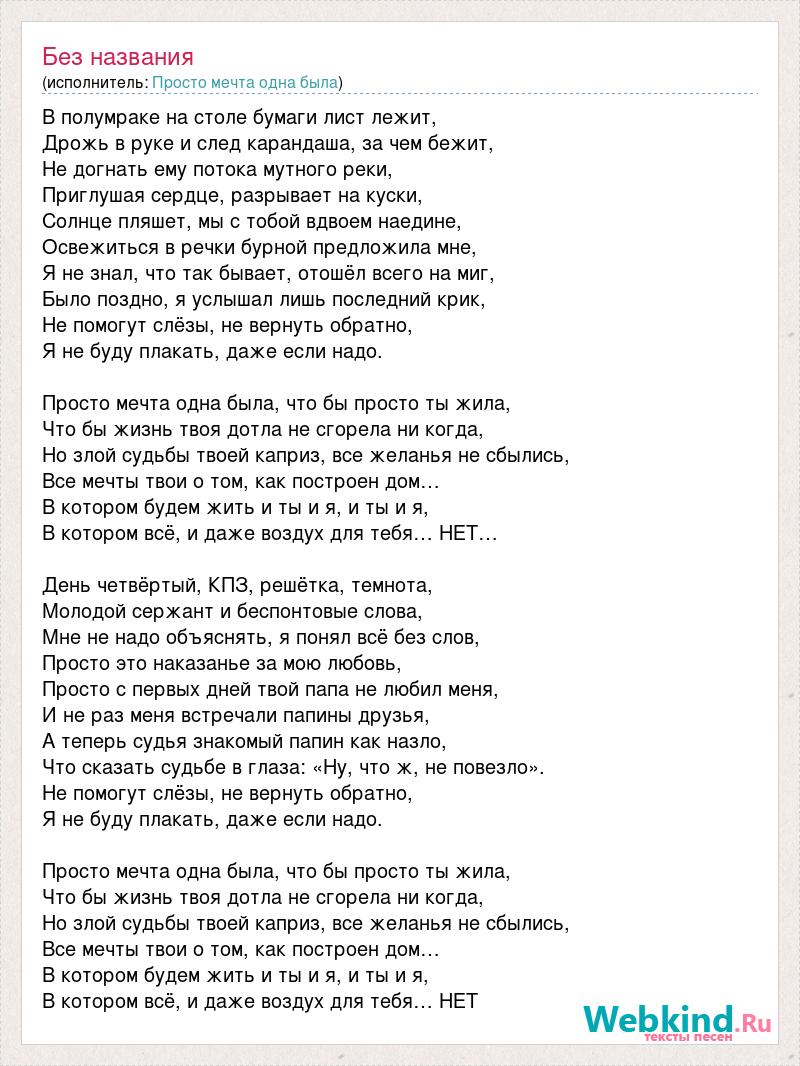 В полумраке на столе бумаги лист лежит, Дрожь в руке и след карандаша, за чем бежит, Не догнать ему потока мутного реки, Приглушая сердце, разрывает на куски, Солнце пляшет, мы с тобой вдвоем наедине, Освежиться в речки бурной предложила мне, Я не знал, что так бывает, отошёл всего на миг, Было поздно, я услышал лишь последний крик, Не помогут слёзы, не вернуть обратно, Я не буду плакать, даже если надо. Просто мечта одна была, что бы просто ты жила, Что бы жизнь твоя дотла не сгорела ни когда, Но злой судьбы твоей каприз, все желанья не сбылись, Все мечты твои о том, как построен дом… В котором будем жить и ты и я, и ты и я, В котором всё, и даже воздух для тебя… НЕТ… День четвёртый, КПЗ, решётка, темнота, Молодой сержант и беспонтовые слова, Мне не надо объяснять, я понял всё без слов, Просто это наказанье за мою любовь, Просто с первых дней твой папа не любил меня, И не раз меня встречали папины друзья, А теперь судья знакомый папин как назло, Что сказать судьбе в глаза: «Ну, что ж, не повезло». Не помогут слёзы, не вернуть обратно, Я не буду плакать, даже если надо. Просто мечта одна была, что бы просто ты жила, Что бы жизнь твоя дотла не сгорела ни когда, Но злой судьбы твоей каприз, все желанья не сбылись, Все мечты твои о том, как построен дом… В котором будем жить и ты и я, и ты и я, В котором всё, и даже воздух для тебя… НЕТ