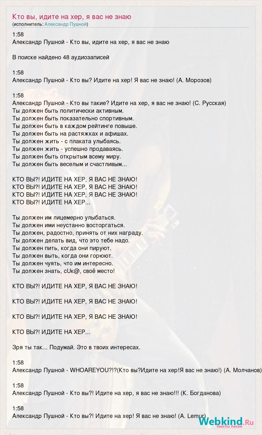 1:58 Александр Пушной - Кто вы, идите на хер, я вас не знаю В поиске найдено 48 аудиозаписей 1:58 Александр Пушной - Кто вы? Идите на хер! Я вас не знаю! (А. Морозов) 1:58 Александр Пушной - Кто вы такие? Идите на хер, я вас не знаю! (С. Русская) Ты должен быть политически активным. Ты должен быть показательно спортивным. Ты должен быть в каждом рейтинге повыше. Ты должен быть на растяжках и афишах. Ты должен жить - с плаката улыбаясь. Ты должен жить - успешно продаваясь. Ты должен быть открытым всему миру. Ты должен быть веселым и счастливым... КТО ВЫ?! ИДИТЕ НА ХЕР, Я ВАС НЕ ЗНАЮ! КТО ВЫ?! ИДИТЕ НА ХЕР, Я ВАС НЕ ЗНАЮ! КТО ВЫ?! ИДИТЕ НА ХЕР, Я ВАС НЕ ЗНАЮ! КТО ВЫ?! ИДИТЕ НА ХЕР... Ты должен им лицемерно улыбаться. Ты должен ими неустанно восторгаться. Ты должен, радостно, принять от них награду. Ты должен делать вид, что это тебе надо. Ты должен пить, когда они пируют. Ты должен выть, когда они горюют. Ты должен чуять, что им интересно. Ты должен знать, сUк@, своё место! КТО ВЫ?! ИДИТЕ НА ХЕР, Я ВАС НЕ ЗНАЮ! КТО ВЫ?! ИДИТЕ НА ХЕР, Я ВАС НЕ ЗНАЮ! КТО ВЫ?! ИДИТЕ НА ХЕР, Я ВАС НЕ ЗНАЮ! КТО ВЫ?! ИДИТЕ НА ХЕР... Зря ты так... Подумай. Это в твоих интересах. 1:58 Александр Пушной - WHOAREYOU?!?(Кто вы?Идите на хер!Я вас не знаю!) (А. Молчанов) 1:58 Александр Пушной - Кто вы?! Идите на хер, я вас не знаю!!! (К. Богданова) 1:58 Александр Пушной - Кто вы?! Идите на хер! Я вас не знаю! (А. Lemur)