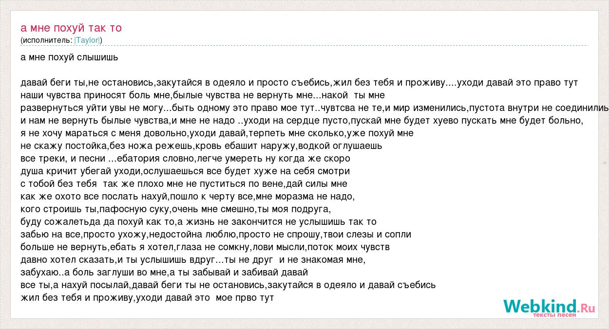 а мне похуй слышишь давай беги ты,не остановись,закутайся в одеяло и просто съебись,жил без тебя и проживу....уходи давай это право тут наши чувства приносят боль мне,былые чувства не вернуть мне...накой ты мне развернуться уйти увы не могу...быть одному это право мое тут..чувтсва не те,и мир изменились,пустота внутри не соединилиь и нам не вернуть былые чувства,и мне не надо ..уходи на сердце пусто,пускай мне будет хуево пускать мне будет больно, я не хочу мараться с меня довольно,уходи давай,терпеть мне сколько,уже похуй мне не скажу постойка,без ножа режешь,кровь ебашит наружу,водкой оглушаешь все треки, и песни ...ебатория словно,легче умереть ну когда же скоро душа кричит убегай уходи,ослушаешься все будет хуже на себя смотри с тобой без тебя так же плохо мне не пуститься по вене,дай силы мне как же охото все послать нахуй,пошло к черту все,мне моразма не надо, кого строишь ты,пафосную суку,очень мне смешно,ты моя подруга, буду сожалетьда да похуй как то,а жизнь не закончится не услышишь так то забью на все,просто ухожу,недостойна люблю,просто не спрошу,твои слезы и сопли больше не вернуть,ебать я хотел,глаза не сомкну,лови мысли,поток моих чувств давно хотел сказать,и ты услышишь вдруг...ты не друг и не знакомая мне, забухаю..а боль заглуши во мне,а ты забывай и забивай давай все ты,а нахуй посылай,давай беги ты не остановись,закутайся в одеяло и давай съебись жил без тебя и проживу,уходи давай это мое прво тут
