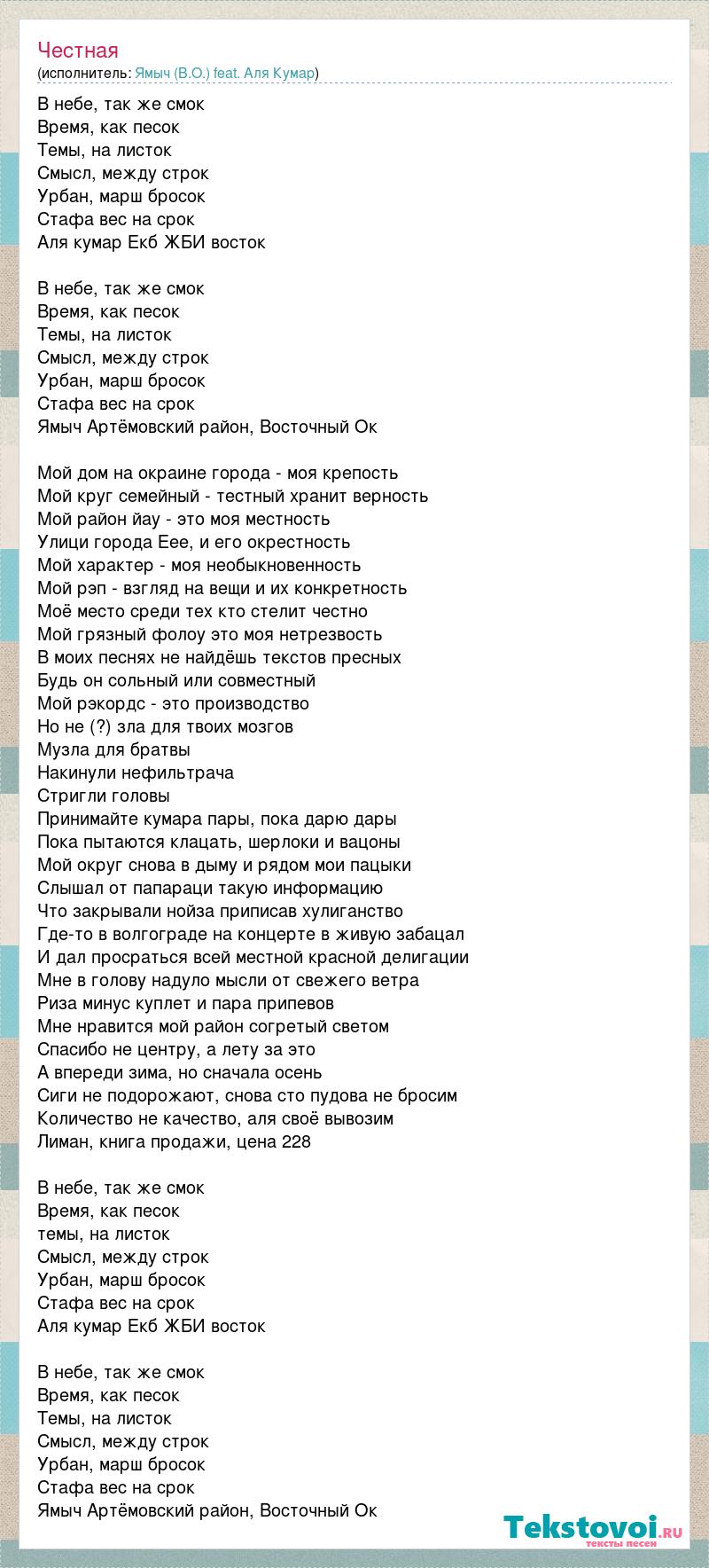 В небе, так же смок Время, как песок Темы, на листок Смысл, между строк Урбан, марш бросок Стафа вес на срок Аля кумар Екб ЖБИ восток В небе, так же смок Время, как песок Темы, на листок Смысл, между строк Урбан, марш бросок Стафа вес на срок Ямыч Артёмовский район, Восточный Ок Мой дом на окраине города - моя крепость Мой круг семейный - тестный хранит верность Мой район йау - это моя местность Улици города Еее, и его окрестность Мой характер - моя необыкновенность Мой рэп - взгляд на вещи и их конкретность Моё место среди тех кто стелит честно Мой грязный фолоу это моя нетрезвость В моих песнях не найдёшь текстов пресных Будь он сольный или совместный Мой рэкордс - это производство Но не (?) зла для твоих мозгов Музла для братвы Накинули нефильтрача Стригли головы Принимайте кумара пары, пока дарю дары Пока пытаются клацать, шерлоки и вацоны Мой округ снова в дыму и рядом мои пацыки Слышал от папараци такую информацию Что закрывали нойза приписав хулиганство Где-то в волгограде на концерте в живую забацал И дал просраться всей местной красной делигации Мне в голову надуло мысли от свежего ветра Риза минус куплет и пара припевов Мне нравится мой район согретый светом Спасибо не центру, а лету за это А впереди зима, но сначала осень Сиги не подорожают, снова сто пудова не бросим Количество не качество, аля своё вывозим Лиман, книга продажи, цена 228 В небе, так же смок Время, как песок темы, на листок Смысл, между строк Урбан, марш бросок Стафа вес на срок Аля кумар Екб ЖБИ восток В небе, так же смок Время, как песок Темы, на листок Смысл, между строк Урбан, марш бросок Стафа вес на срок Ямыч Артёмовский район, Восточный Ок