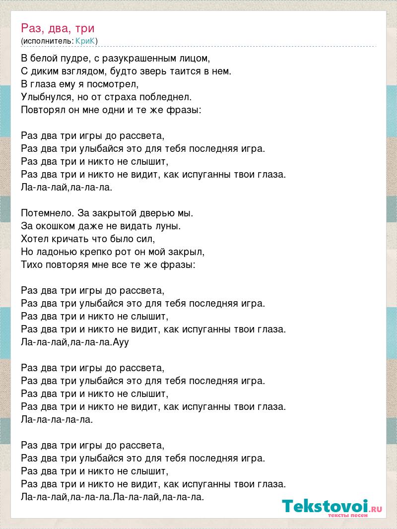 В белой пудре, с разукрашенным лицом, С диким взглядом, будто зверь таится в нем. В глаза ему я посмотрел, Улыбнулся, но от страха побледнел. Повторял он мне одни и те же фразы: Раз два три игры до рассвета, Раз два три улыбайся это для тебя последняя игра. Раз два три и никто не слышит, Раз два три и никто не видит, как испуганны твои глаза. Ла-ла-лай,ла-ла-ла. Потемнело. За закрытой дверью мы. За окошком даже не видать луны. Хотел кричать что было сил, Но ладонью крепко рот он мой закрыл, Тихо повторяя мне все те же фразы: Раз два три игры до рассвета, Раз два три улыбайся это для тебя последняя игра. Раз два три и никто не слышит, Раз два три и никто не видит, как испуганны твои глаза. Ла-ла-лай,ла-ла-ла.Ауу Раз два три игры до рассвета, Раз два три улыбайся это для тебя последняя игра. Раз два три и никто не слышит, Раз два три и никто не видит, как испуганны твои глаза. Ла-ла-ла-ла-ла. Раз два три игры до рассвета, Раз два три улыбайся это для тебя последняя игра. Раз два три и никто не слышит, Раз два три и никто не видит, как испуганны твои глаза. Ла-ла-лай,ла-ла-ла.Ла-ла-лай,ла-ла-ла.