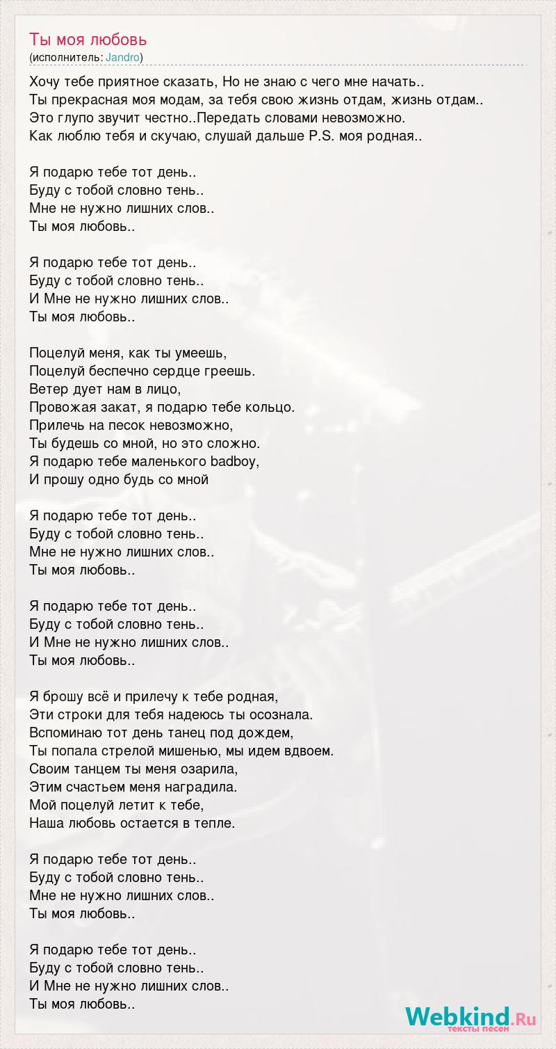 Хочу тебе приятное сказать, Но не знаю с чего мне начать.. Ты прекрасная моя модам, за тебя свою жизнь отдам, жизнь отдам.. Это глупо звучит честно..Передать словами невозможно. Как люблю тебя и скучаю, слушай дальше P.S. моя родная.. Я подарю тебе тот день.. Буду с тобой словно тень.. Мне не нужно лишних слов.. Ты моя любовь.. Я подарю тебе тот день.. Буду с тобой словно тень.. И Мне не нужно лишних слов.. Ты моя любовь.. Поцелуй меня, как ты умеешь, Поцелуй беспечно сердце греешь. Ветер дует нам в лицо, Провожая закат, я подарю тебе кольцо. Прилечь на песок невозможно, Ты будешь со мной, но это сложно. Я подарю тебе маленького badboy, И прошу одно будь со мной Я подарю тебе тот день.. Буду с тобой словно тень.. Мне не нужно лишних слов.. Ты моя любовь.. Я подарю тебе тот день.. Буду с тобой словно тень.. И Мне не нужно лишних слов.. Ты моя любовь.. Я брошу всё и прилечу к тебе родная, Эти строки для тебя надеюсь ты осознала. Вспоминаю тот день танец под дождем, Ты попала стрелой мишенью, мы идем вдвоем. Своим танцем ты меня озарила, Этим счастьем меня наградила. Мой поцелуй летит к тебе, Наша любовь остается в тепле. Я подарю тебе тот день.. Буду с тобой словно тень.. Мне не нужно лишних слов.. Ты моя любовь.. Я подарю тебе тот день.. Буду с тобой словно тень.. И Мне не нужно лишних слов.. Ты моя любовь..