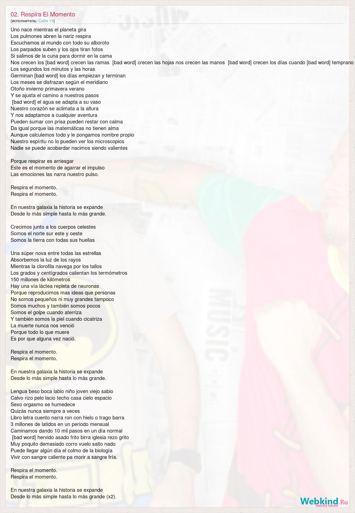 Uno nace mientras el planeta gira Los pulmones abren la nariz respira Escuchamos al mundo con todo su alboroto Los parpados suben y los ojos tiran fotos Si salimos de la cuna para dormir en la cama Nos crecen los [bad word] crecen las ramas [bad word] crecen las hojas nos crecen las manos [bad word] crecen los días cuando [bad word] temprano Los segundos los minutos y las horas Germinan [bad word] los días empiezan y terminan Los meses se disfrazan según el meridiano Otoño invierno primavera verano Y se ajusta el camino a nuestros pasos [bad word] el agua se adapta a su vaso Nuestro corazón se aclimata a la altura Y nos adaptamos a cualquier aventura Pueden sumar con prisa pueden restar con calma Da igual porque las matemáticas no tienen alma Aunque calculemos todo y le pongamos nombre propio Nuestro espíritu no lo pueden ver los microscopios Nadie se puede acobardar nacimos siendo valientes Porque respirar es arriesgar Este es el momento de agarrar el impulso Las emociones las narra nuestro pulso. Respira el momento. Respira el momento. En nuestra galaxia la historia se expande Desde lo más simple hasta lo más grande. Crecimos junto a los cuerpos celestes Somos el norte sur este y oeste Somos la tierra con todas sus huellas Una súper nova entre todas las estrellas Absorbemos la luz de los rayos Mientras la clorofila navega por los tallos Los grados y centígrados calientan los termómetros 150 millones de kilómetros Hay una vía láctea repleta de neuronas Porque reproducimos mas ideas que personas No somos pequeños ni muy grandes tampoco Somos muchos y también somos pocos Somos el golpe cuando aterriza Y también somos la piel cuando cicatriza La muerte nunca nos venció Porque todo lo que muere Es por que alguna vez nació. Respira el momento. Respira el momento. En nuestra galaxia la historia se expande Desde lo más simple hasta lo más grande. Lengua beso boca labio niño joven viejo sabio Calvo rizo pelo lacio techo casa cielo espacio Sexo orgasmo se humedece Quizás nunca siempre a veces Libro letra cuento narra ron con hielo o trago barra 3 millones de latidos en un periodo mensual Caminamos dando 10 mil pasos en un día normal [bad word] hervido asado frito birra iglesia rezo grito Muy poquito demasiado corro vuelo salto nado Puede llegar algún día el colmo de la biología Vivir con sangre caliente pa morir a sangre fría. Respira el momento. Respira el momento. En nuestra galaxia la historia se expande Desde lo más simple hasta lo más grande (x2).