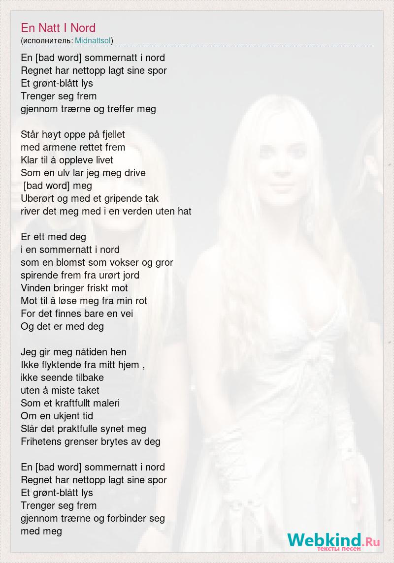 En [bad word] sommernatt i nord Regnet har nettopp lagt sine spor Et grønt-blått lys Trenger seg frem gjennom trærne og treffer meg Står høyt oppe på fjellet med armene rettet frem Klar til å oppleve livet Som en ulv lar jeg meg drive [bad word] meg Uberørt og med et gripende tak river det meg med i en verden uten hat Er ett med deg i en sommernatt i nord som en blomst som vokser og gror spirende frem fra urørt jord Vinden bringer friskt mot Mot til å løse meg fra min rot For det finnes bare en vei Og det er med deg Jeg gir meg nåtiden hen Ikke flyktende fra mitt hjem , ikke seende tilbake uten å miste taket Som et kraftfullt maleri Om en ukjent tid Slår det praktfulle synet meg Frihetens grenser brytes av deg En [bad word] sommernatt i nord Regnet har nettopp lagt sine spor Et grønt-blått lys Trenger seg frem gjennom trærne og forbinder seg med meg