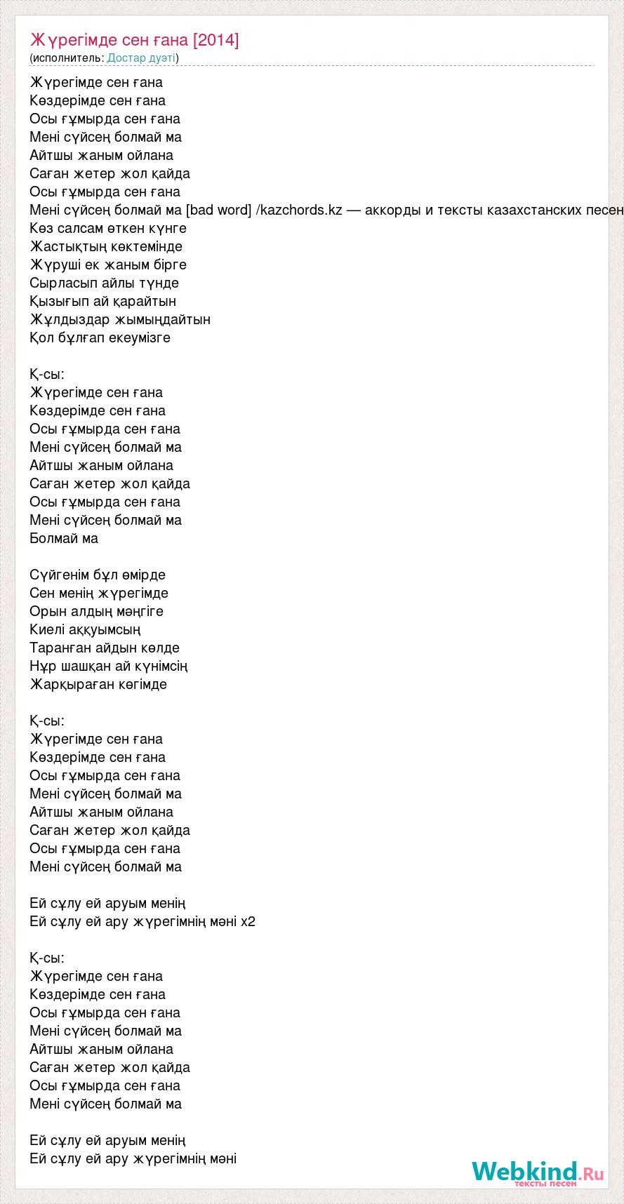 Жүрегімде сен ғана Көздерімде сен ғана Осы ғұмырда сен ғана Мені сүйсең болмай ма Айтшы жаным ойлана Саған жетер жол қайда Осы ғұмырда сен ғана Мені сүйсең болмай ма [bad word] /kazchords.kz — аккорды и тексты казахстанских песен Көз салсам өткен күнге Жастықтың көктемінде Жүруші ек жаным бірге Сырласып айлы түнде Қызығып ай қарайтын Жұлдыздар жымыңдайтын Қол бұлғап екеумізге Қ-сы: Жүрегімде сен ғана Көздерімде сен ғана Осы ғұмырда сен ғана Мені сүйсең болмай ма Айтшы жаным ойлана Саған жетер жол қайда Осы ғұмырда сен ғана Мені сүйсең болмай ма Болмай ма Сүйгенім бұл өмірде Сен менің жүрегімде Орын алдың мәңгіге Киелі аққуымсың Таранған айдын көлде Нұр шашқан ай күнімсің Жарқыраған көгімде Қ-сы: Жүрегімде сен ғана Көздерімде сен ғана Осы ғұмырда сен ғана Мені сүйсең болмай ма Айтшы жаным ойлана Саған жетер жол қайда Осы ғұмырда сен ғана Мені сүйсең болмай ма Ей сұлу ей аруым менің Ей сұлу ей ару жүрегімнің мәні х2 Қ-сы: Жүрегімде сен ғана Көздерімде сен ғана Осы ғұмырда сен ғана Мені сүйсең болмай ма Айтшы жаным ойлана Саған жетер жол қайда Осы ғұмырда сен ғана Мені сүйсең болмай ма Ей сұлу ей аруым менің Ей сұлу ей ару жүрегімнің мәні