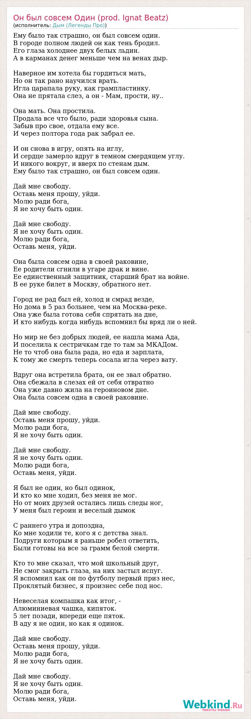 Ему было так страшно, он был совсем один. В городе полном людей он как тень бродил. Его глаза холоднее двух белых льдин. А в карманах денег меньше чем на венах дыр. Наверное им хотела бы гордиться мать, Но он так рано научился врать. Игла царапала руку, как грампластинку. Она не прятала слез, а он - Мам, прости, ну.. Она мать. Она простила. Продала все что было, ради здоровья сына. Забыв про свое, отдала ему все. И через полтора года рак забрал ее. И он снова в игру, опять на иглу, И сердце замерло вдруг в темном смердящем углу. И никого вокруг, и вверх по стенам дым. Ему было так страшно, он был совсем один. Дай мне свободу. Оставь меня прошу, уйди. Молю ради бога, Я не хочу быть один. Дай мне свободу. Я не хочу быть один. Молю ради бога, Оставь меня, уйди. Она была совсем одна в своей раковине, Ее родители сгнили в угаре драк и вине. Ее единственный защитник, старший брат на войне. В ее руке билет в Москву, обратного нет. Город не рад был ей, холод и смрад везде, Но дома в 5 раз больнее, чем на Москва-реке. Она уже была готова себя спрятать на дне, И кто нибудь когда нибудь вспомнил бы вряд ли о ней. Но мир не без добрых людей, ее нашла мама Ада, И поселила к сестричкам где то там за МКАДом. Не то чтоб она была рада, но еда и зарплата, К тому же смерть теперь сосала игла через вату. Вдруг она встретила брата, он ее звал обратно. Она сбежала в слезах ей от себя отвратно Она уже давно жила на героиновом дне. Она была совсем одна в своей раковине. Дай мне свободу. Оставь меня прошу, уйди. Молю ради бога, Я не хочу быть один. Дай мне свободу. Я не хочу быть один. Молю ради бога, Оставь меня, уйди. Я был не один, но был одинок, И кто ко мне ходил, без меня не мог. Но от моих друзей остались лишь следы ног, У меня был героин и веселый дымок С раннего утра и допоздна, Ко мне ходили те, кого я с детства знал. Подруги которым я раньше робел ответить, Были готовы на все за грамм белой смерти. Кто то мне сказал, что мой школьный друг, Не смог закрыть глаза, на них застыл испуг. Я вспомнил как он по футболу первый приз нес, Проклятый бизнес, я произнес себе под нос. Невеселая компашка как итог, - Алюминиевая чашка, кипяток. 5 лет позади, впереди еще пяток. В аду я не один, но как я одинок. Дай мне свободу. Оставь меня прошу, уйди. Молю ради бога, Я не хочу быть один. Дай мне свободу. Я не хочу быть один. Молю ради бога, Оставь меня, уйди.