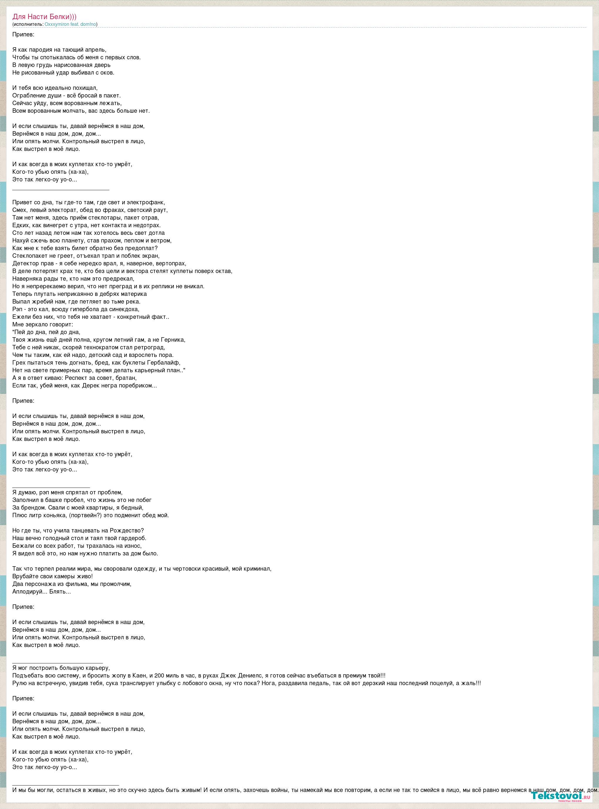 Припев: Я как пародия на тающий апрель, Чтобы ты спотыкалась об меня с первых слов. В левую грудь нарисованная дверь Не рисованный удар выбивал с оков. И тебя всю идеально похищал, Ограбление души - всё бросай в пакет. Сейчас уйду, всем ворованным лежать, Всем ворованным молчать, вас здесь больше нет. И если слышишь ты, давай вернёмся в наш дом, Вернёмся в наш дом, дом, дом... Или опять молчи. Контрольный выстрел в лицо, Как выстрел в моё лицо. И как всегда в моих куплетах кто-то умрёт, Кого-то убью опять (ха-ха), Это так легко-оу уо-о... ______________________________ Привет со дна, ты где-то там, где свет и электрофанк, Смех, левый электорат, обед во фраках, светский раут, Там нет меня, здесь приём стеклотары, пакет отрав, Едких, как винегрет с утра, нет контакта и недотрах. Сто лет назад летом нам так хотелось весь свет дотла Нахуй сжечь всю планету, став прахом, пеплом и ветром, Как мне к тебе взять билет обратно без предоплат? Стеклопакет не греет, отъехал трап и поблек экран, Детектор прав - я себе нередко врал, я, наверное, вертопрах, В деле потерпят крах те, кто без цели и вектора стелят куплеты поверх октав, Наверняка рады те, кто нам это предрекал, Но я непререкаемо верил, что нет преград и в их реплики не вникал. Теперь плутать неприкаянно в дебрях материка Выпал жребий нам, где петляет во тьме река. Рэп - это кал, всюду гипербола да синекдоха, Ежели без них, что тебя не хватает - конкретный факт.. Мне зеркало говорит: "Пей до дна, пей до дна, Твоя жизнь ещё дней полна, кругом летний гам, а не Герника, Тебе с ней никак, скорей технократом стал ретроград, Чем ты таким, как ей надо, детский сад и взрослеть пора. Грех пытаться тень догнать, бред, как буклеты Гербалайф, Нет на свете примерных пар, время делать карьерный план.." А я в ответ киваю: Респект за совет, братан, Если так, убей меня, как Дерек негра поребриком... Припев: И если слышишь ты, давай вернёмся в наш дом, Вернёмся в наш дом, дом, дом... Или опять молчи. Контрольный выстрел в лицо, Как выстрел в моё лицо. И как всегда в моих куплетах кто-то умрёт, Кого-то убью опять (ха-ха), Это так легко-оу уо-о... ________________________ Я думаю, рэп меня спрятал от проблем, Заполнил в башке пробел, что жизнь это не побег За брендом. Свали с моей квартиры, я бедный, Плюс литр коньяка, (портвейн?) это подменит обед мой. Но где ты, что учила танцевать на Рождество? Наш вечно голодный стол и таял твой гардероб. Бежали со всех работ, ты трахалась на износ, Я видел всё это, но нам нужно платить за дом было. Так что терпел реалии мира, мы своровали одежду, и ты чертовски красивый, мой криминал, Врубайте свои камеры живо! Два персонажа из фильма, мы промолчим, Аплодируй... Блять... Припев: И если слышишь ты, давай вернёмся в наш дом, Вернёмся в наш дом, дом, дом... Или опять молчи. Контрольный выстрел в лицо, Как выстрел в моё лицо. ____________________________ Я мог построить большую карьеру, Подъебать всю систему, и бросить жопу в Каен, и 200 миль в час, в руках Джек Дениелс, я готов сейчас въебаться в премиум твой!!! Рулю на встречную, увидив тебя, сука транслирует улыбку с лобового окна, ну что пока? Нога, раздавила педаль, так ой вот дерзкий наш последний поцелуй, а жаль!!! Припев: И если слышишь ты, давай вернёмся в наш дом, Вернёмся в наш дом, дом, дом... Или опять молчи. Контрольный выстрел в лицо, Как выстрел в моё лицо. И как всегда в моих куплетах кто-то умрёт, Кого-то убью опять (ха-ха), Это так легко-оу 