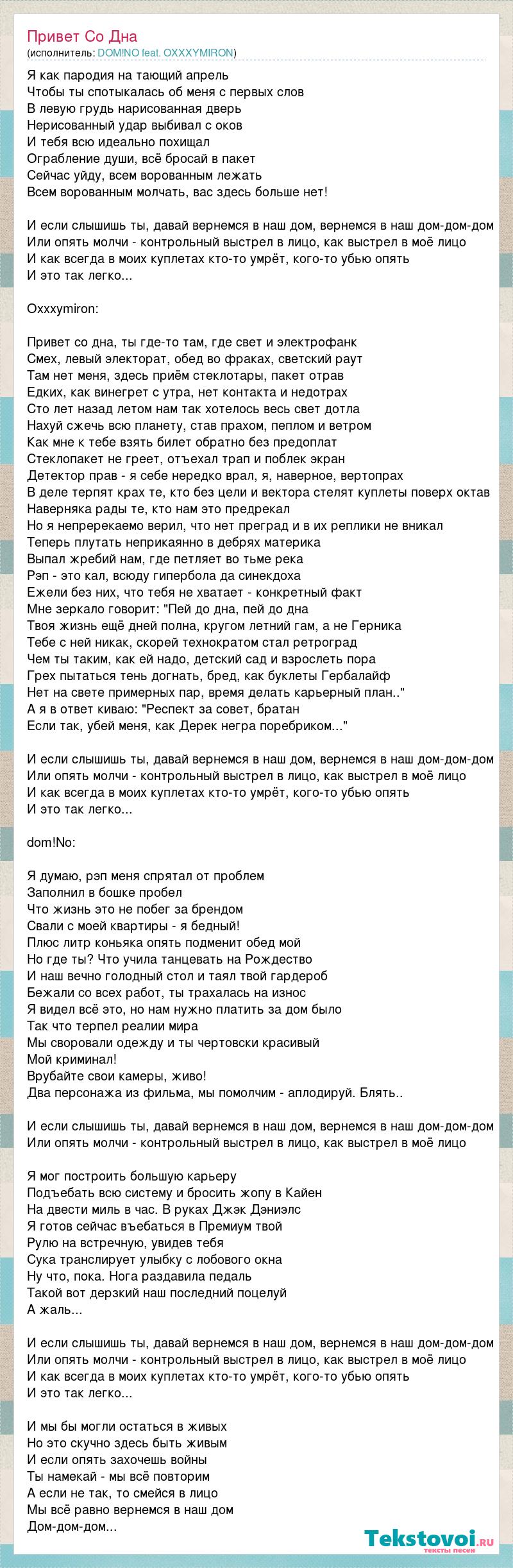 Я как пародия на тающий апрель Чтобы ты спотыкалась об меня с первых слов В левую грудь нарисованная дверь Нерисованный удар выбивал с оков И тебя всю идеально похищал Ограбление души, всё бросай в пакет Сейчас уйду, всем ворованным лежать Всем ворованным молчать, вас здесь больше нет! И если слышишь ты, давай вернемся в наш дом, вернемся в наш дом-дом-дом Или опять молчи - контрольный выстрел в лицо, как выстрел в моё лицо И как всегда в моих куплетах кто-то умрёт, кого-то убью опять И это так легко... Oxxxymiron: Привет со дна, ты где-то там, где свет и электрофанк Смех, левый электорат, обед во фраках, светский раут Там нет меня, здесь приём стеклотары, пакет отрав Едких, как винегрет с утра, нет контакта и недотрах Сто лет назад летом нам так хотелось весь свет дотла Нахуй сжечь всю планету, став прахом, пеплом и ветром Как мне к тебе взять билет обратно без предоплат Стеклопакет не греет, отъехал трап и поблек экран Детектор прав - я себе нередко врал, я, наверное, вертопрах В деле терпят крах те, кто без цели и вектора стелят куплеты поверх октав Наверняка рады те, кто нам это предрекал Но я непререкаемо верил, что нет преград и в их реплики не вникал Теперь плутать неприкаянно в дебрях материка Выпал жребий нам, где петляет во тьме река Рэп - это кал, всюду гипербола да синекдоха Ежели без них, что тебя не хватает - конкретный факт Мне зеркало говорит: "Пей до дна, пей до дна Твоя жизнь ещё дней полна, кругом летний гам, а не Герника Тебе с ней никак, скорей технократом стал ретроград Чем ты таким, как ей надо, детский сад и взрослеть пора Грех пытаться тень догнать, бред, как буклеты Гербалайф Нет на свете примерных пар, время делать карьерный план.." А я в ответ киваю: "Респект за совет, братан Если так, убей меня, как Дерек негра поребриком..." И если слышишь ты, давай вернемся в наш дом, вернемся в наш дом-дом-дом Или опять молчи - контрольный выстрел в лицо, как выстрел в моё лицо И как всегда в моих куплетах кто-то умрёт, кого-то убью опять И это так легко... dom!No: Я думаю, рэп меня спрятал от проблем Заполнил в бошке пробел Что жизнь это не побег за брендом Свали с моей квартиры - я бедный! Плюс литр коньяка опять подменит обед мой Но где ты? Что учила танцевать на Рождество И наш вечно голодный стол и таял твой гардероб Бежали со всех работ, ты трахалась на износ Я видел всё это, но нам нужно платить за дом было Так что терпел реалии мира Мы своровали одежду и ты чертовски красивый Мой криминал! Врубайте свои камеры, живо! Два персонажа из фильма, мы помолчим - аплодируй. Блять.. И если слышишь ты, давай вернемся в наш дом, вернемся в наш дом-дом-дом Или опять молчи - контрольный выстрел в лицо, как выстрел в моё лицо Я мог построить большую карьеру Подъебать всю систему и бросить жопу в Кайен На двести миль в час. В руках Джэк Дэниэлс Я готов сейчас въебаться в Премиум твой Рулю на встречную, увидев тебя Сука транслирует улыбку с лобового окна Ну что, пока. Нога раздавила педаль Такой вот дерзкий наш последний поцелуй А жаль... И если слышишь ты, давай вернемся в наш дом, вернемся в наш дом-дом-дом Или опять молчи - контрольный выстрел в лицо, как выстрел в моё лицо И как всегда в моих куплетах кто-то умрёт, кого-то убью опять И это так легко... И мы бы могли остаться в живых Но это скучно здесь быть живым И если опять захочешь войны Ты намекай - мы всё повторим А если не так, то смейся 