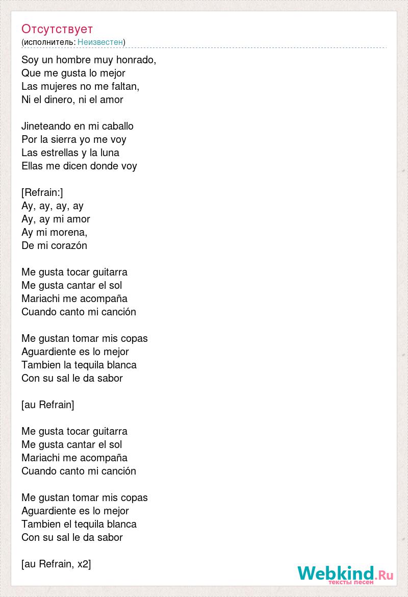 Soy un hombre muy honrado, Que me gusta lo mejor Las mujeres no me faltan, Ni el dinero, ni el amor Jineteando en mi caballo Por la sierra yo me voy Las estrellas y la luna Ellas me dicen donde voy [Refrain:] Ay, ay, ay, ay Ay, ay mi amor Ay mi morena, De mi corazón Me gusta tocar guitarra Me gusta cantar el sol Mariachi me acompaña Cuando canto mi canción Me gustan tomar mis copas Aguardiente es lo mejor Tambien la tequila blanca Con su sal le da sabor [au Refrain] Me gusta tocar guitarra Me gusta cantar el sol Mariachi me acompaña Cuando canto mi canción Me gustan tomar mis copas Aguardiente es lo mejor Tambien el tequila blanca Con su sal le da sabor [au Refrain, x2]