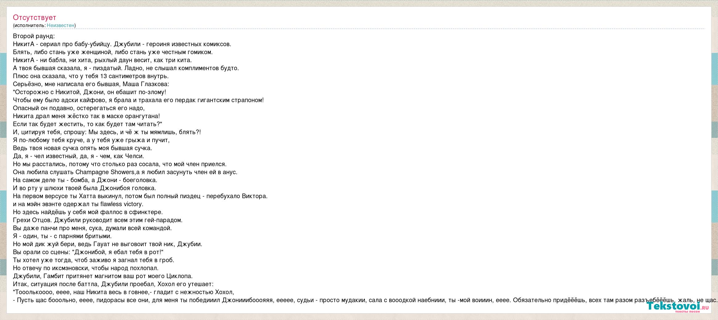 Второй раунд: НикитА - сериал про бабу-убийцу. Джубили - героиня известных комиксов. Блять, либо стань уже женщиной, либо стань уже честным гомиком. НикитА - ни бабла, ни хита, рыхлый даун весит, как три кита. А твоя бывшая сказала, я - пиздатый. Ладно, не слышал комплиментов будто. Плюс она сказала, что у тебя 13 сантиметров внутрь. Серьёзно, мне написала его бывшая, Маша Глазкова: "Осторожно с Никитой, Джони, он ебашит по-злому! Чтобы ему было адски кайфово, я брала и трахала его пердак гигантским страпоном! Опасный он подавно, остерегаться его надо, Никита драл меня жёстко так в маске орангутана! Если так будет жестить, то как будет там читать?" И, цитируя тебя, спрошу: Мы здесь, и чё ж ты мямлишь, блять?! Я по-любому тебя круче, а у тебя уже грыжа и пучит, Ведь твоя новая сучка опять моя бывшая сучка. Да, я - чел известный, да, я - чем, как Челси. Но мы расстались, потому что столько раз сосала, что мой член приелся. Она любила слушать Champagne Showers,а я любил засунуть член ей в анус. На самом деле ты - бомба, а Джони - боеголовка. И во рту у шлюхи твоей была Джонибоя головка. На первом версусе ты Хатта выкинул, потом был полный пиздец - перебухало Виктора. и на мэйн эвэнте одержал ты flawless victory. Но здесь найдёшь у себя мой фаллос в сфинктере. Грехи Отцов. Джубили руководит всем этим гей-парадом. Вы даже панчи про меня, сука, думали всей командой. Я - один, ты - с парнями бритыми. Но мой дик жуй бери, ведь Гауат не выговоит твой ник, Джубии. Вы орали со сцены: "Джонибой, я ебал тебя в рот!" Ты хотел уже тогда, чтоб заживо я загнал тебя в гроб. Но отвечу по иксмэновски, чтобы народ похлопал. Джубили, Гамбит притянет магнитом ваш рот моего Циклопа. Итак, ситуация после баттла, Джубили проебал, Хохол его утешает: "Тооолькоооо, ееее, наш Никита весь в говнее,- гладит с нежностью Хохол, - Пусть щас бооольно, ееее, пидорасы все они, для меня ты победииил Джонииибооояяя, еееее, судьи - просто мудакии, сала с вооодкой наебниии, ты -мой воииин, ееее. Обязательно придёёёшь, всех там разом разъебёёёшь, жаль, не щас.