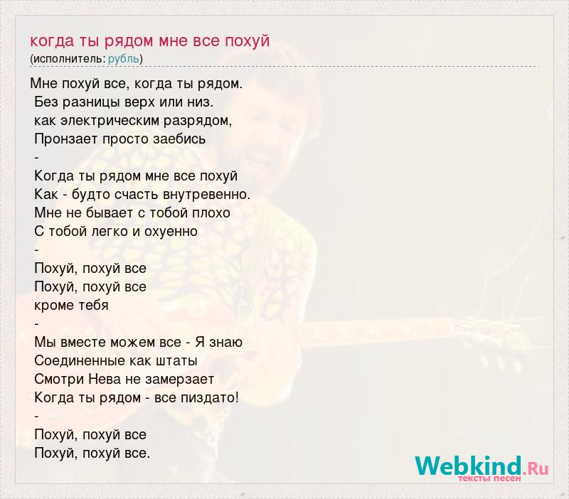 Мне похуй все, когда ты рядом. Без разницы верх или низ. как электрическим разрядом, Пронзает просто заебись - Когда ты рядом мне все похуй Как - будто счасть внутревенно. Мне не бывает с тобой плохо С тобой легко и охуенно - Похуй, похуй все Похуй, похуй все кроме тебя - Мы вместе можем все - Я знаю Соединенные как штаты Смотри Нева не замерзает Когда ты рядом - все пиздато! - Похуй, похуй все Похуй, похуй все.