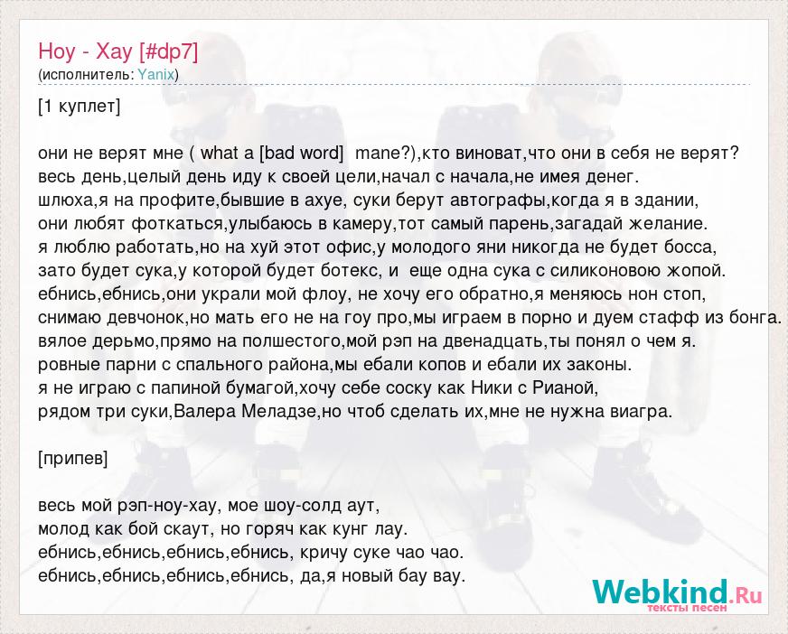 [1 куплет] они не верят мне ( what a [bad word] mane?),кто виноват,что они в себя не верят? весь день,целый день иду к своей цели,начал с начала,не имея денег. шлюха,я на профите,бывшие в ахуе, суки берут автографы,когда я в здании, они любят фоткаться,улыбаюсь в камеру,тот самый парень,загадай желание. я люблю работать,но на хуй этот офис,у молодого яни никогда не будет босса, зато будет сука,у которой будет ботекс, и еще одна сука с силиконовою жопой. ебнись,ебнись,они украли мой флоу, не хочу его обратно,я меняюсь нон стоп, снимаю девчонок,но мать его не на гоу про,мы играем в порно и дуем стафф из бонга. вялое дерьмо,прямо на полшестого,мой рэп на двенадцать,ты понял о чем я. ровные парни с спального района,мы ебали копов и ебали их законы. я не играю с папиной бумагой,хочу себе соску как Ники с Рианой, рядом три суки,Валера Меладзе,но чтоб сделать их,мне не нужна виагра. [припев] весь мой рэп-ноу-хау, мое шоу-солд аут, молод как бой скаут, но горяч как кунг лау. ебнись,ебнись,ебнись,ебнись, кричу суке чао чао. ебнись,ебнись,ебнись,ебнись, да,я новый бау вау.