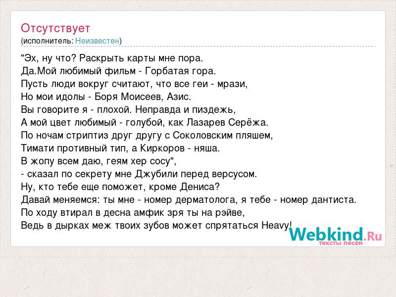 "Эх, ну что? Раскрыть карты мне пора. Да.Мой любимый фильм - Горбатая гора. Пусть люди вокруг считают, что все геи - мрази, Но мои идолы - Боря Моисеев, Азис. Вы говорите я - плохой. Неправда и пиздежь, А мой цвет любимый - голубой, как Лазарев Серёжа. По ночам стриптиз друг другу с Соколовским пляшем, Тимати противный тип, а Киркоров - няша. В жопу всем даю, геям хер сосу", - сказал по секрету мне Джубили перед версусом. Ну, кто тебе еще поможет, кроме Дениса? Давай меняемся: ты мне - номер дерматолога, я тебе - номер дантиста. По ходу втирал в десна амфик зря ты на рэйве, Ведь в дырках меж твоих зубов может спрятаться Heavy!