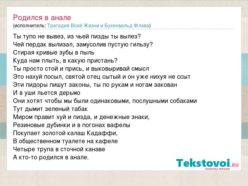Ты тупо не вывез, из чьей пизды ты вылез? Чей пердак вылизал, замусолив пустую гильзу? Стирая кривые зубы в пыль Куда нам плыть, в какую пристань? Ты просто стой и прись, и выковыривай смысл Это нахуй посыл, святой отец сытый и он уже нихуя не ссыт Эти пидоры пишут законы, ты по рукам и ногам закован И в уши льется дерьмо Они хотят чтобы мы были одинаковыми, послушными собаками Тут дымит зеленый табак Миром правит хуй и пизда, и денежные знаки, Резиновые дубинки и в погонах вафелы Покупает золотой калаш Кадаффи, В общественном туалете на кафеле Четыре трупа в сточной канаве А кто-то родился в анале.
