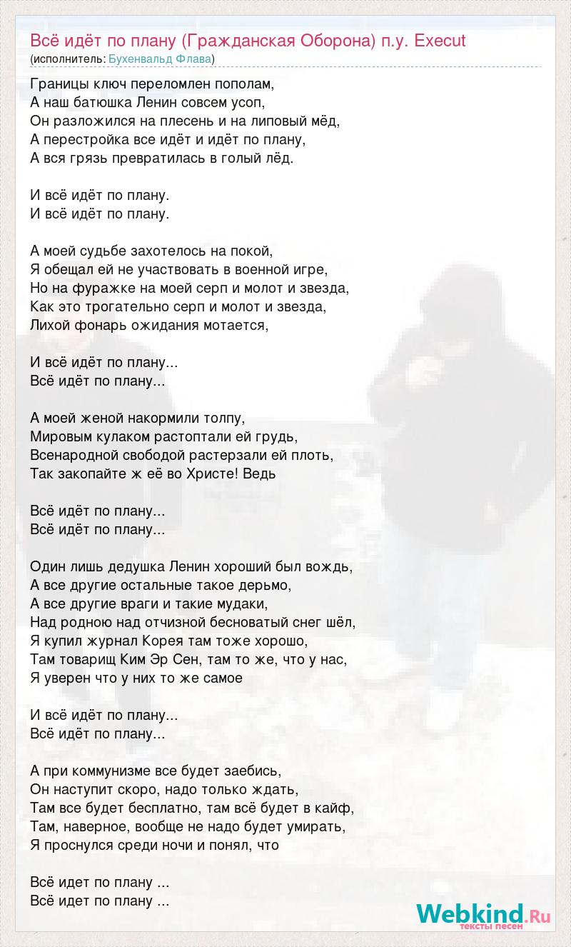 Границы ключ переломлен пополам, А наш батюшка Ленин совсем усоп, Он разложился на плесень и на липовый мёд, А перестройка все идёт и идёт по плану, А вся грязь превратилась в голый лёд. И всё идёт по плану. И всё идёт по плану. А моей судьбе захотелось на покой, Я обещал ей не участвовать в военной игре, Но на фуражке на моей серп и молот и звезда, Как это трогательно серп и молот и звезда, Лихой фонарь ожидания мотается, И всё идёт по плану... Всё идёт по плану... А моей женой накормили толпу, Мировым кулаком растоптали ей грудь, Всенародной свободой растерзали ей плоть, Так закопайте ж её во Христе! Ведь Всё идёт по плану... Всё идёт по плану... Один лишь дедушка Ленин хороший был вождь, А все другие остальные такое дерьмо, А все другие враги и такие мудаки, Над родною над отчизной бесноватый снег шёл, Я купил журнал Корея там тоже хорошо, Там товарищ Ким Эр Сен, там то же, что у нас, Я уверен что у них то же самое И всё идёт по плану... Всё идёт по плану... А при коммунизме все будет заебись, Он наступит скоро, надо только ждать, Там все будет бесплатно, там всё будет в кайф, Там, наверное, вообще не надо будет умирать, Я проснулся среди ночи и понял, что Всё идет по плану ... Всё идет по плану ...