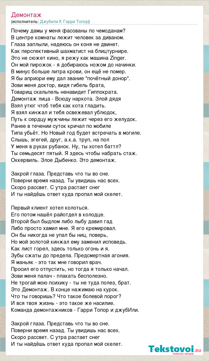 Почему дамы у меня фасованы по чемоданам? В центре комнаты лежит человек за диваном. Глаза заплыли, надеюсь он коня не двинет. Как перспективный шахматист на блицтурнире. Это не сюжет кино, я режу как машина Zinger. Он мой пирожок - я добираюсь ножом до начинки. В минус больше литра крови, он ещё не помер. Я бы априори ему дал звание "почётный донор". Зови меня доктор, видя гибель брата, Товарищ скальпель ненавидит Гиппократа. Демонтаж лица - Всюду наркота. Злой дядя Взял утюг чтоб тебя как кота гладить. Я взял кинжал и тебя освежевал ублюдок, Путь к сердцу мужчины лежит через его желудок. Ранее в течении суток кричал по мобиле Типа убьёт. Но Новый год будет встречать в могиле. Слышь, эгегей, друг, а.к.а. труп, на пол У меня в руках рубанок. Ну, ты хотел баттл? Ты семьдесят пятый. Я здесь чтобы набрать стаж. Оккервиль. Злое Дыбенко. Это демонтаж. Закрой глаза. Представь что ты во сне. Поверни время назад. Ты увидишь нас всех. Скоро рассвет. С утра растает снег И ты найдёшь ответ куда пропал мой скелет. Первый клиент хотел колоться. Его потом нашёл райотдел в колодце. Второй был быдлом либо лыбу давил гад Либо просто хамил мне. Я его кремировал. Он бы никогда не упал бы ниц, поверь, Но мой золотой кинжал ему заменил исповедь. Как лист горел, здесь только огонь и я. Зубы сжаты до предела. Предсмертная агония. Я маньяк - это так мне говорил врач. Просил его отпустить, но тогда я только начал. Зови меня палач - плакать бесполезно. Не трогай мою психику - ты не туда полез, брат. Это Демонтаж. В конце нажимаю на курок. Что ты говоришь? Что такое болевой порог? И вся твоя жизнь - это такое же насилие. Команда демонтажников - Гарри Топор и джубИли. Закрой глаза. Представь что ты во сне. Поверни время назад. Ты увидишь нас всех. Скоро рассвет. С утра растает снег И ты найдёшь ответ куда пропал мой скелет.