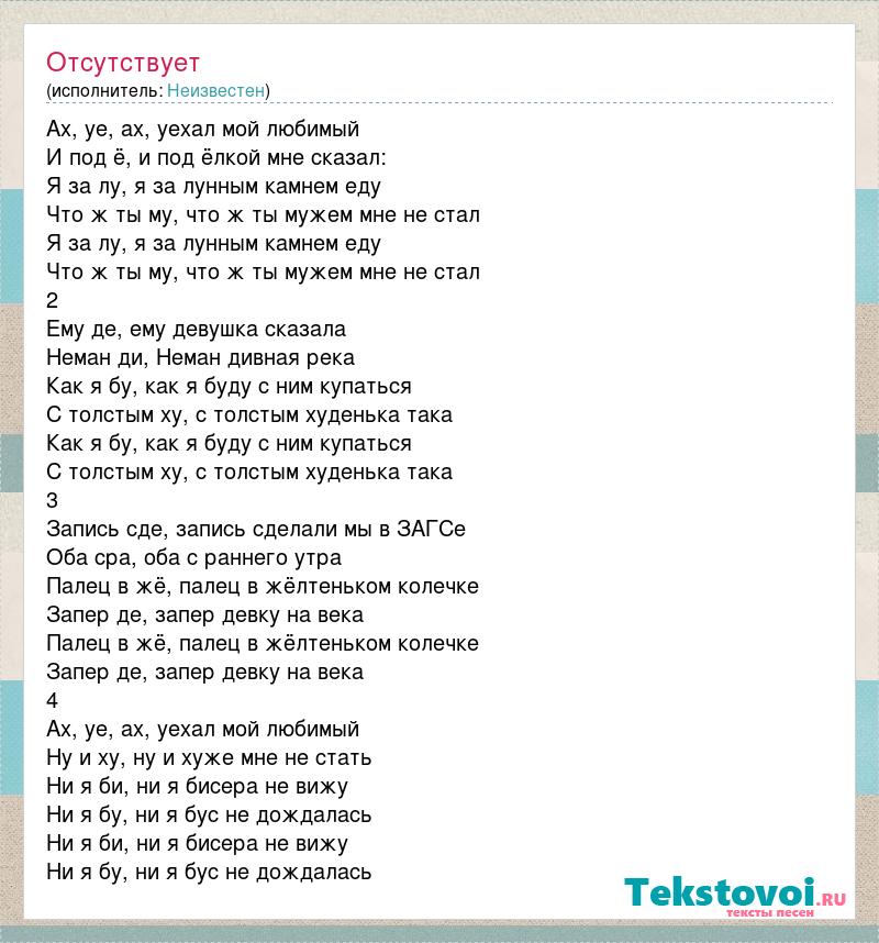 Ах, уе, ах, уехал мой любимый И под ё, и под ёлкой мне сказал: Я за лу, я за лунным камнем еду Что ж ты му, что ж ты мужем мне не стал Я за лу, я за лунным камнем еду Что ж ты му, что ж ты мужем мне не стал 2 Ему де, ему девушка сказала Неман ди, Неман дивная река Как я бу, как я буду с ним купаться С толстым ху, с толстым худенька така Как я бу, как я буду с ним купаться С толстым ху, с толстым худенька така 3 Запись сде, запись сделали мы в ЗАГСе Оба сра, оба с раннего утра Палец в жё, палец в жёлтеньком колечке Запер де, запер девку на века Палец в жё, палец в жёлтеньком колечке Запер де, запер девку на века 4 Ах, уе, ах, уехал мой любимый Ну и ху, ну и хуже мне не стать Ни я би, ни я бисера не вижу Ни я бу, ни я бус не дождалась Ни я би, ни я бисера не вижу Ни я бу, ни я бус не дождалась