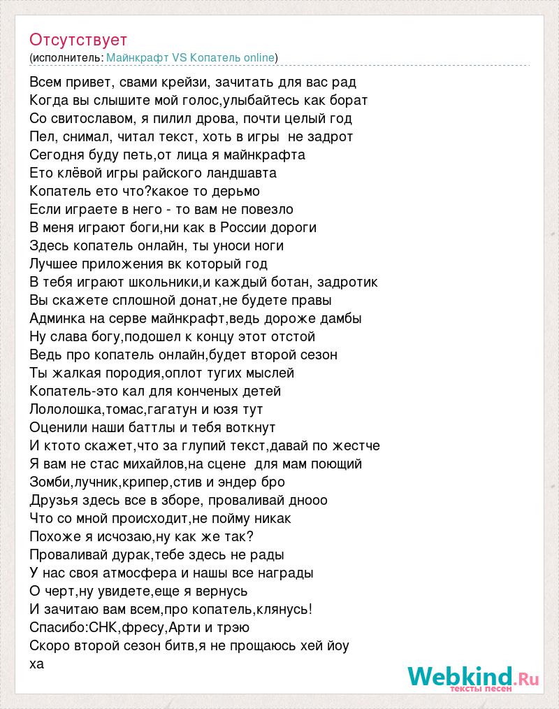 Всем привет, свами крейзи, зачитать для вас рад Когда вы слышите мой голос,улыбайтесь как борат Со свитославом, я пилил дрова, почти целый год Пел, снимал, читал текст, хоть в игры не задрот Сегодня буду петь,от лица я майнкрафта Ето клёвой игры райского ландшавта Копатель ето что?какое то дерьмо Если играете в него - то вам не повезло В меня играют боги,ни как в России дороги Здесь копатель онлайн, ты уноси ноги Лучшее приложения вк который год В тебя играют школьники,и каждый ботан, задротик Вы скажете сплошной донат,не будете правы Админка на серве майнкрафт,ведь дороже дамбы Ну слава богу,подошел к концу этот отстой Ведь про копатель онлайн,будет второй сезон Ты жалкая породия,оплот тугих мыслей Копатель-это кал для конченых детей Лололошка,томас,гагатун и юзя тут Оценили наши баттлы и тебя воткнут И ктото скажет,что за глупий текст,давай по жестче Я вам не стас михайлов,на сцене для мам поющий Зомби,лучник,крипер,стив и эндер бро Друзья здесь все в зборе, проваливай днооо Что со мной происходит,не пойму никак Похоже я исчозаю,ну как же так? Проваливай дурак,тебе здесь не рады У нас своя атмосфера и нашы все награды О черт,ну увидете,еще я вернусь И зачитаю вам всем,про копатель,клянусь! Спасибо:СНК,фресу,Арти и трэю Скоро второй сезон битв,я не прощаюсь хей йоу ха
