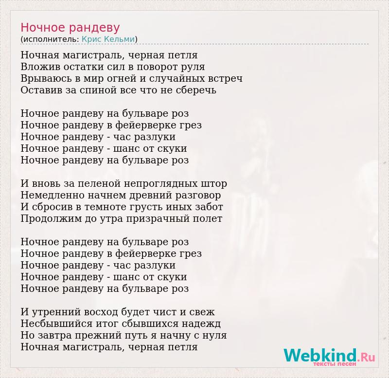 Ночная магистраль, черная петля Вложив остатки сил в поворот руля Врываюсь в мир огней и случайных встреч Оставив за спиной все что не сберечь Ночное рандеву на бульваре роз Ночное рандеву в фейерверке грез Ночное рандеву - час разлуки Ночное рандеву - шанс от скуки Ночное рандеву на бульваре роз И вновь за пеленой непроглядных штор Немедленно начнем древний разговор И сбросив в темноте грусть иных забот Продолжим до утра призрачный полет Ночное рандеву на бульваре роз Ночное рандеву в фейерверке грез Ночное рандеву - час разлуки Ночное рандеву - шанс от скуки Ночное рандеву на бульваре роз И утренний восход будет чист и свеж Несбывшийся итог сбывшихся надежд Но завтра прежний путь я начну с нуля Ночная магистраль, черная петля