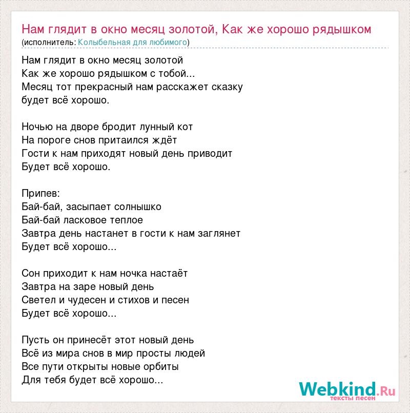 Нам глядит в окно месяц золотой Как же хорошо рядышком с тобой... Месяц тот прекрасный нам расскажет сказку будет всё хорошо. Ночью на дворе бродит лунный кот На пороге снов притаился ждёт Гости к нам приходят новый день приводит Будет всё хорошо. Припев: Бай-бай, засыпает солнышко Бай-бай ласковое теплое Завтра день настанет в гости к нам заглянет Будет всё хорошо... Сон приходит к нам ночка настаёт Завтра на заре новый день Светел и чудесен и стихов и песен Будет всё хорошо... Пусть он принесёт этот новый день Всё из мира снов в мир просты людей Все пути открыты новые орбиты Для тебя будет всё хорошо...