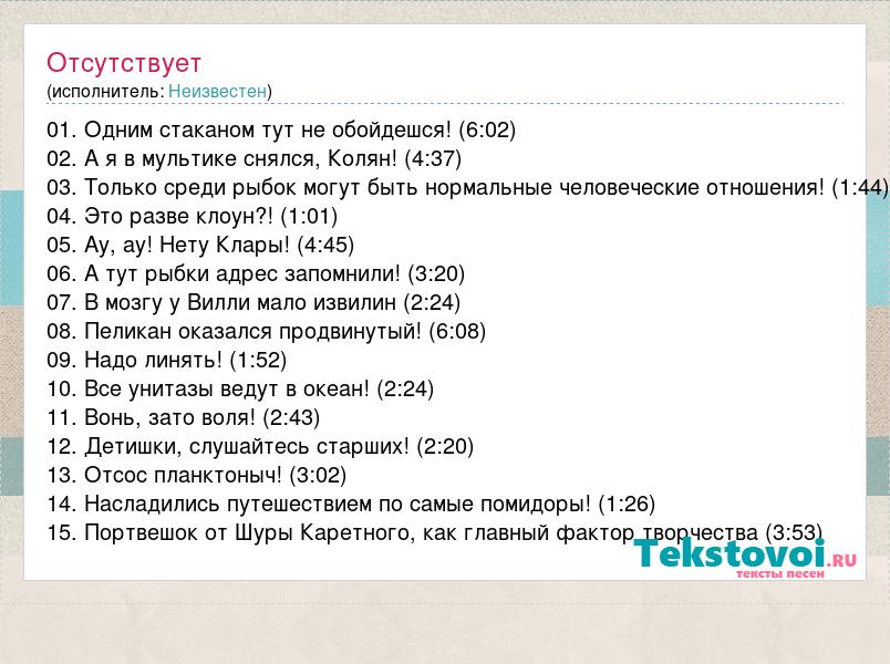 01. Одним стаканом тут не обойдешся! (6:02) 02. А я в мультике снялся, Колян! (4:37) 03. Только среди рыбок могут быть нормальные человеческие отношения! (1:44) 04. Это разве клоун?! (1:01) 05. Ау, ау! Нету Клары! (4:45) 06. А тут рыбки адрес запомнили! (3:20) 07. В мозгу у Вилли мало извилин (2:24) 08. Пеликан оказался продвинутый! (6:08) 09. Надо линять! (1:52) 10. Все унитазы ведут в океан! (2:24) 11. Вонь, зато воля! (2:43) 12. Детишки, слушайтесь старших! (2:20) 13. Отсос планктоныч! (3:02) 14. Насладились путешествием по самые помидоры! (1:26) 15. Портвешок от Шуры Каретного, как главный фактор творчества (3:53)