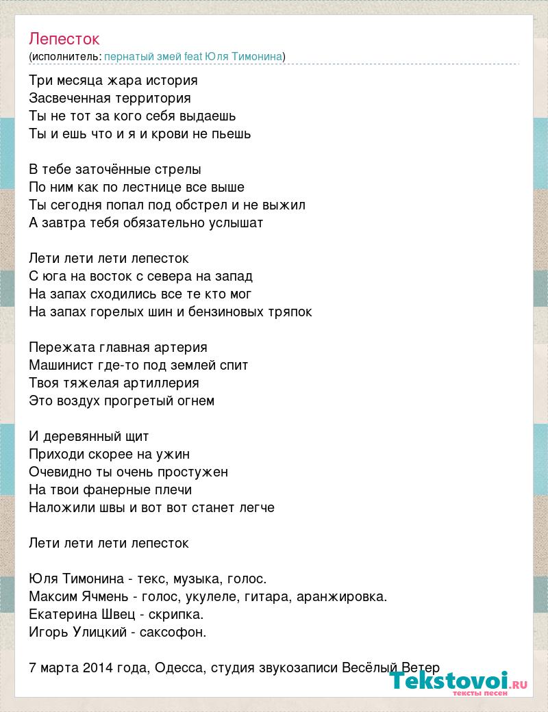 Три месяца жара история Засвеченная территория Ты не тот за кого себя выдаешь Ты и ешь что и я и крови не пьешь В тебе заточённые стрелы По ним как по лестнице все выше Ты сегодня попал под обстрел и не выжил А завтра тебя обязательно услышат Лети лети лети лепесток С юга на восток с севера на запад На запах сходились все те кто мог На запах горелых шин и бензиновых тряпок Пережата главная артерия Машинист где-то под землей спит Твоя тяжелая артиллерия Это воздух прогретый огнем И деревянный щит Приходи скорее на ужин Очевидно ты очень простужен На твои фанерные плечи Наложили швы и вот вот станет легче Лети лети лети лепесток Юля Тимонина - текс, музыка, голос. Максим Ячмень - голос, укулеле, гитара, аранжировка. Екатерина Швец - скрипка. Игорь Улицкий - саксофон. 7 марта 2014 года, Одесса, студия звукозаписи Весёлый Ветер