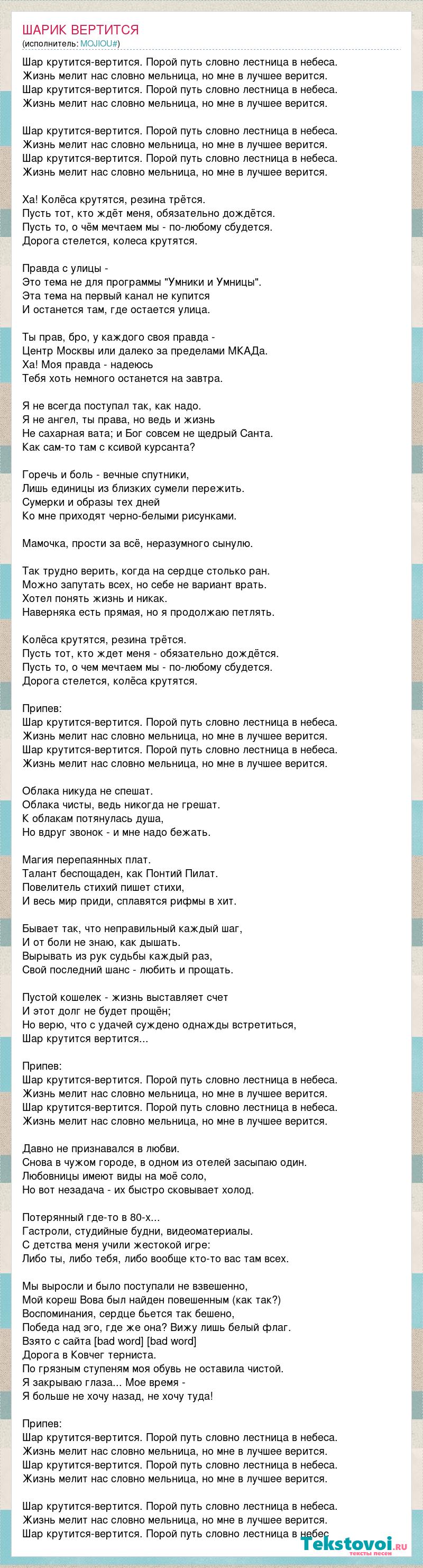 Шар крутится-вертится. Порой путь словно лестница в небеса. Жизнь мелит нас словно мельница, но мне в лучшее верится. Шар крутится-вертится. Порой путь словно лестница в небеса. Жизнь мелит нас словно мельница, но мне в лучшее верится. Шар крутится-вертится. Порой путь словно лестница в небеса. Жизнь мелит нас словно мельница, но мне в лучшее верится. Шар крутится-вертится. Порой путь словно лестница в небеса. Жизнь мелит нас словно мельница, но мне в лучшее верится. Ха! Колёса крутятся, резина трётся. Пусть тот, кто ждёт меня, обязательно дождётся. Пусть то, о чём мечтаем мы - по-любому сбудется. Дорога стелется, колеса крутятся. Правда с улицы - Это тема не для программы "Умники и Умницы". Эта тема на первый канал не купится И останется там, где остается улица. Ты прав, бро, у каждого своя правда - Центр Москвы или далеко за пределами МКАДа. Ха! Моя правда - надеюсь Тебя хоть немного останется на завтра. Я не всегда поступал так, как надо. Я не ангел, ты права, но ведь и жизнь Не сахарная вата; и Бог совсем не щедрый Санта. Как сам-то там с ксивой курсанта? Горечь и боль - вечные спутники, Лишь единицы из близких сумели пережить. Сумерки и образы тех дней Ко мне приходят черно-белыми рисунками. Мамочка, прости за всё, неразумного сынулю. Так трудно верить, когда на сердце столько ран. Можно запутать всех, но себе не вариант врать. Хотел понять жизнь и никак. Наверняка есть прямая, но я продолжаю петлять. Колёса крутятся, резина трётся. Пусть тот, кто ждет меня - обязательно дождётся. Пусть то, о чем мечтаем мы - по-любому сбудется. Дорога стелется, колёса крутятся. Припев: Шар крутится-вертится. Порой путь словно лестница в небеса. Жизнь мелит нас словно мельница, но мне в лучшее верится. Шар крутится-вертится. Порой путь словно лестница в небеса. Жизнь мелит нас словно мельница, но мне в лучшее верится. Облака никуда не спешат. Облака чисты, ведь никогда не грешат. К облакам потянулась душа, Но вдруг звонок - и мне надо бежать. Магия перепаянных плат. Талант беспощаден, как Понтий Пилат. Повелитель стихий пишет стихи, И весь мир приди, сплавятся рифмы в хит. Бывает так, что неправильный каждый шаг, И от боли не знаю, как дышать. Вырывать из рук судьбы каждый раз, Свой последний шанс - любить и прощать. Пустой кошелек - жизнь выставляет счет И этот долг не будет прощён; Но верю, что с удачей суждено однажды встретиться, Шар крутится вертится... Припев: Шар крутится-вертится. Порой путь словно лестница в небеса. Жизнь мелит нас словно мельница, но мне в лучшее верится. Шар крутится-вертится. Порой путь словно лестница в небеса. Жизнь мелит нас словно мельница, но мне в лучшее верится. Давно не признавался в любви. Снова в чужом городе, в одном из отелей засыпаю один. Любовницы имеют виды на моё соло, Но вот незадача - их быстро сковывает холод. Потерянный где-то в 80-х... Гастроли, студийные будни, видеоматериалы. С детства меня учили жестокой игре: Либо ты, либо тебя, либо вообще кто-то вас там всех. Мы выросли и было поступали не взвешенно, Мой кореш Вова был найден повешенным (как так?) Воспоминания, сердце бьется так бешено, Победа над эго, где же она? Вижу лишь белый флаг. Взято с сайта [bad word] [bad word] Дорога в Ковчег терниста. По грязным ступеням моя обувь не оставила чистой. Я закрываю глаза... Мое время - Я больше не хочу назад, не хочу туда! Припев: Шар крутится-вертится. Порой путь словно