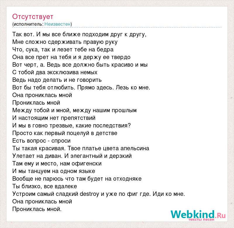 Так вот. И мы все ближе подходим друг к другу, Мне сложно сдерживать правую руку Что, сука, так и лезет тебе на бедра Она все прет на тебя и я держу ее твердо Вот черт, а. Ведь все должно быть красиво и мы С тобой два эксклюзива немых Ведь надо делать и не говорить Вот бы тебя отлюбить. Прямо здесь. Лезь ко мне. Она прониклась мной Прониклась мной Между тобой и мной, между нашим прошлым И настоящим нет препятствий И мы в говно трезвые, какие последствия? Просто как первый поцелуй в детстве Есть вопрос - спроси Ты такая красивая. Твое платье цвета апельсина Улетает на диван. И элегантный и дерзкий Там ему и место, нам офигенски И мы танцуем на одном языке Вообще не парюсь что там будет на отходняке Ты близко, все вдалеке Устроим самый сладкий destroy и уже по фиг где. Иди ко мне. Она прониклась мной Прониклась мной.