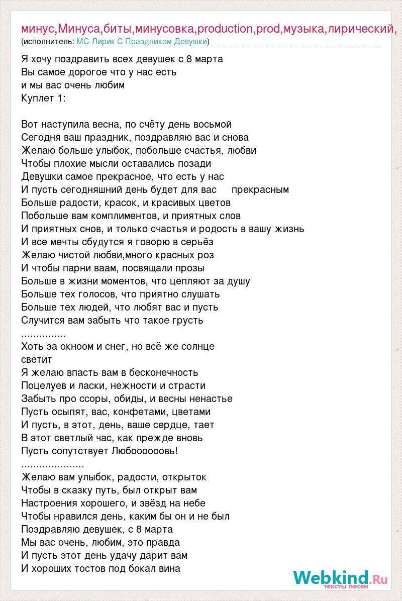 Я хочу поздравить всех девушек с 8 марта Вы самое дорогое что у нас есть и мы вас очень любим Куплет 1: Вот наступила весна, по счёту день восьмой Сегодня ваш праздник, поздравляю вас и снова Желаю больше улыбок, побольше счастья, любви Чтобы плохие мысли оставались позади Девушки самое прекрасное, что есть у нас И пусть сегодняшний день будет для вас прекрасным Больше радости, красок, и красивых цветов Побольше вам комплиментов, и приятных слов И приятных снов, и только счастья и родость в вашу жизнь И все мечты сбудутся я говорю в серьёз Желаю чистой любви,много красных роз И чтобы парни ваам, посвящали прозы Больше в жизни моментов, что цепляют за душу Больше тех голосов, что приятно слушать Больше тех людей, что любят вас и пусть Случится вам забыть что такое грусть ............... Хоть за окноом и снег, но всё же солнце светит Я желаю впасть вам в бесконечность Поцелуев и ласки, нежности и страсти Забыть про ссоры, обиды, и весны ненастье Пусть осыпят, вас, конфетами, цветами И пусть, в этот, день, ваше сердце, тает В этот светлый час, как прежде вновь Пусть сопутствует Любоооооовь! ..................... Желаю вам улыбок, радости, открыток Чтобы в сказку путь, был открыт вам Настроения хорошего, и звёзд на небе Чтобы нравился день, каким бы он и не был Поздравляю девушек, с 8 марта Мы вас очень, любим, это правда И пусть этот день удачу дарит вам И хороших тостов под бокал вина