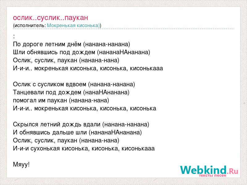 : По дороге летним днём (нанана-нанана) Шли обнявшись под дождем (нананаНАнанана) Ослик, суслик, паукан (нанана-нана) И-и-и.. мокренькая кисонька, кисонька, кисонькааа Ослик с сусликом вдвоем (нанана-нанана) Танцевали под дождем (нанаНАнанана) помогал им паукан (нанана-нана) И-и-и.. мокренькая кисонька, кисонька, кисонька Скрылся летний дождь вдали (нанана-нанана) И обнявшись дальше шли (нананаНАнанана) Ослик, суслик, паукан (нанана-нана) И-и-и сухонькая кисонька, кисонька, кисонькааа Мяуу!