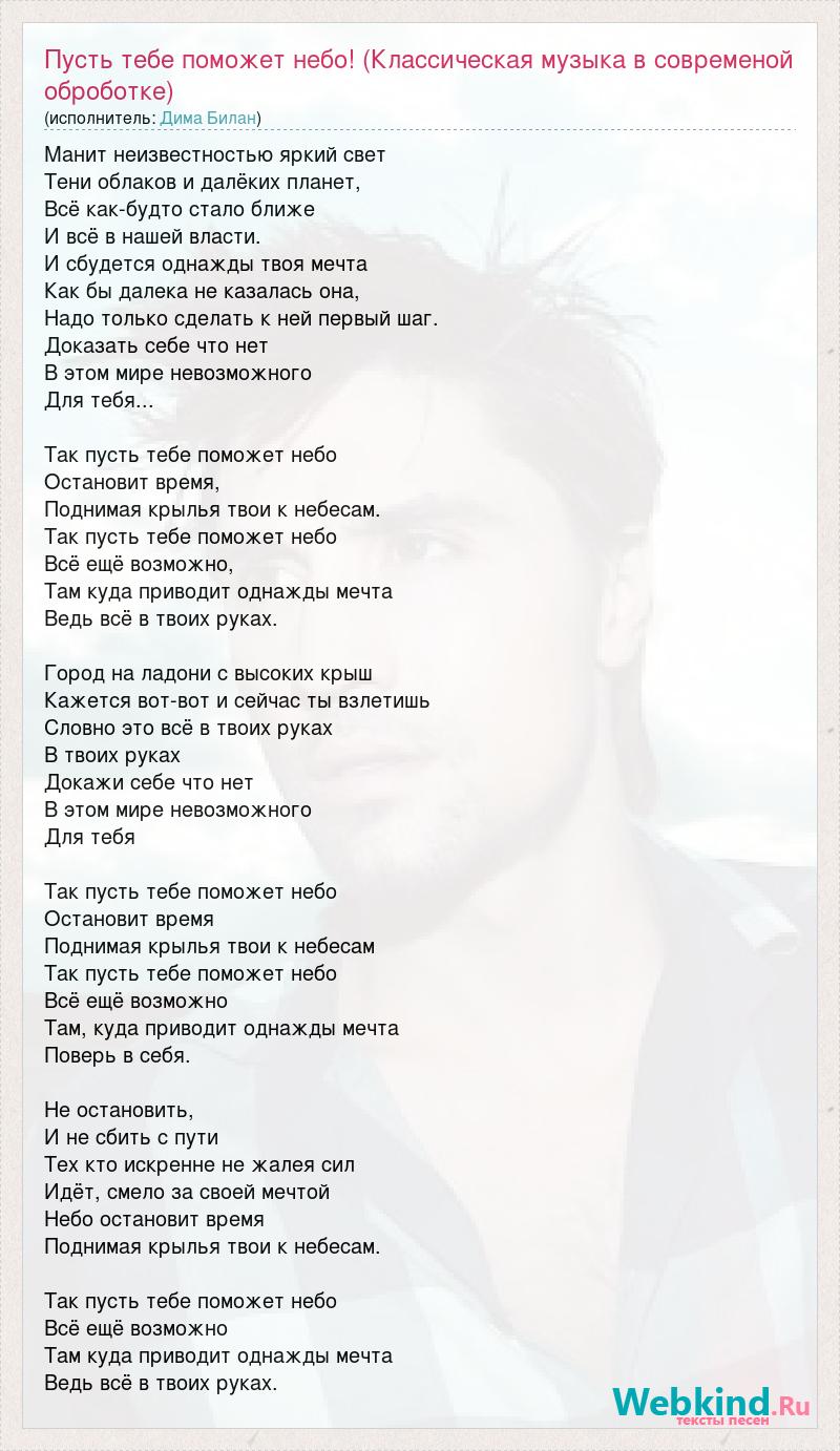 Манит неизвестностью яркий свет Тени облаков и далёких планет, Всё как-будто стало ближе И всё в нашей власти. И сбудется однажды твоя мечта Как бы далека не казалась она, Надо только сделать к ней первый шаг. Доказать себе что нет В этом мире невозможного Для тебя... Так пусть тебе поможет небо Остановит время, Поднимая крылья твои к небесам. Так пусть тебе поможет небо Всё ещё возможно, Там куда приводит однажды мечта Ведь всё в твоих руках. Город на ладони с высоких крыш Кажется вот-вот и сейчас ты взлетишь Словно это всё в твоих руках В твоих руках Докажи себе что нет В этом мире невозможного Для тебя Так пусть тебе поможет небо Остановит время Поднимая крылья твои к небесам Так пусть тебе поможет небо Всё ещё возможно Там, куда приводит однажды мечта Поверь в себя. Не остановить, И не сбить с пути Тех кто искренне не жалея сил Идёт, смело за своей мечтой Небо остановит время Поднимая крылья твои к небесам. Так пусть тебе поможет небо Всё ещё возможно Там куда приводит однажды мечта Ведь всё в твоих руках.