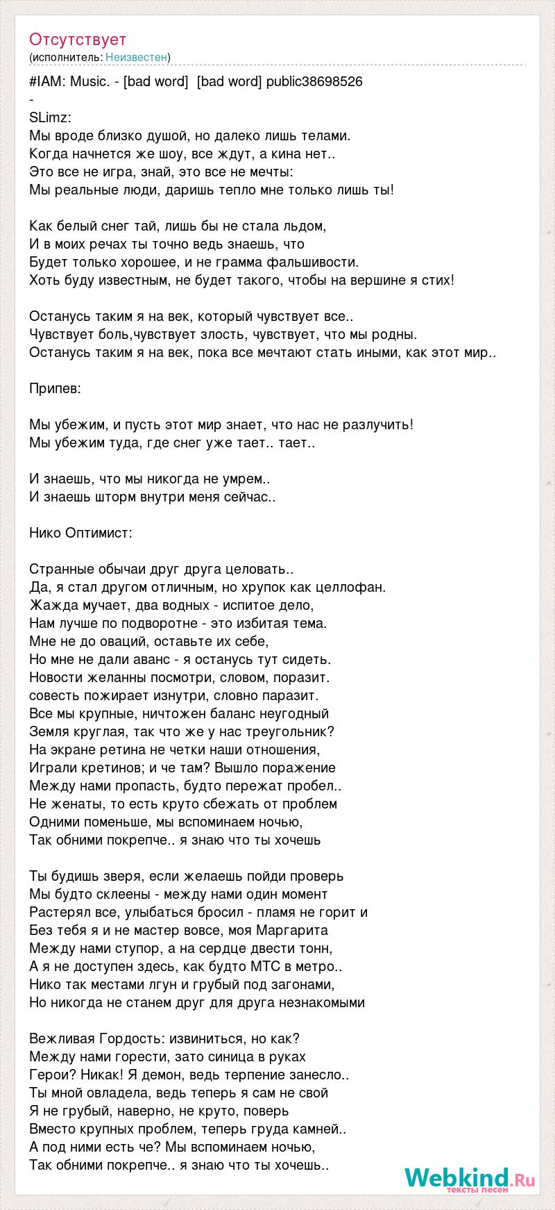 #IAM: Music. - [bad word] [bad word] public38698526 - SLimz: Мы вроде близко душой, но далеко лишь телами. Когда начнется же шоу, все ждут, а кина нет.. Это все не игра, знай, это все не мечты: Мы реальные люди, даришь тепло мне только лишь ты! Как белый снег тай, лишь бы не стала льдом, И в моих речах ты точно ведь знаешь, что Будет только хорошее, и не грамма фальшивости. Хоть буду известным, не будет такого, чтобы на вершине я стих! Останусь таким я на век, который чувствует все.. Чувствует боль,чувствует злость, чувствует, что мы родны. Останусь таким я на век, пока все мечтают стать иными, как этот мир.. Припев: Мы убежим, и пусть этот мир знает, что нас не разлучить! Мы убежим туда, где снег уже тает.. тает.. И знаешь, что мы никогда не умрем.. И знаешь шторм внутри меня сейчас.. Нико Оптимист: Странные обычаи друг друга целовать.. Да, я стал другом отличным, но хрупок как целлофан. Жажда мучает, два водных - испитое дело, Нам лучше по подворотне - это избитая тема. Мне не до оваций, оставьте их себе, Но мне не дали аванс - я останусь тут сидеть. Новости желанны посмотри, словом, поразит. совесть пожирает изнутри, словно паразит. Все мы крупные, ничтожен баланс неугодный Земля круглая, так что же у нас треугольник? На экране ретина не четки наши отношения, Играли кретинов; и че там? Вышло поражение Между нами пропасть, будто пережат пробел.. Не женаты, то есть круто сбежать от проблем Одними поменьше, мы вспоминаем ночью, Так обними покрепче.. я знаю что ты хочешь Ты будишь зверя, если желаешь пойди проверь Мы будто склеены - между нами один момент Растерял все, улыбаться бросил - пламя не горит и Без тебя я и не мастер вовсе, моя Маргарита Между нами ступор, а на сердце двести тонн, А я не доступен здесь, как будто МТС в метро.. Нико так местами лгун и грубый под загонами, Но никогда не станем друг для друга незнакомыми Вежливая Гордость: извиниться, но как? Между нами горести, зато синица в руках Герои? Никак! Я демон, ведь терпение занесло.. Ты мной овладела, ведь теперь я сам не свой Я не грубый, наверно, не круто, поверь Вместо крупных проблем, теперь груда камней.. А под ними есть че? Мы вспоминаем ночью, Так обними покрепче.. я знаю что ты хочешь..