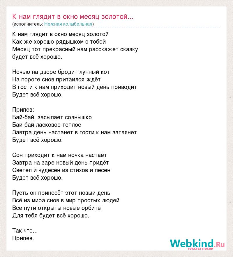 К нам глядит в окно месяц золотой Как же хорошо рядышком с тобой Месяц тот прекрасный нам расскажет сказку будет всё хорошо. Ночью на дворе бродит лунный кот На пороге снов притаился ждёт В гости к нам приходит новый день приводит Будет всё хорошо. Припев: Бай-бай, засыпает солнышко Бай-бай ласковое теплое Завтра день настанет в гости к нам заглянет Будет всё хорошо. Сон приходит к нам ночка настаёт Завтра на заре новый день придёт Светел и чудесен из стихов и песен Будет всё хорошо. Пусть он принесёт этот новый день Всё из мира снов в мир простых людей Все пути открыты новые орбиты Для тебя будет всё хорошо. Так что... Припев.