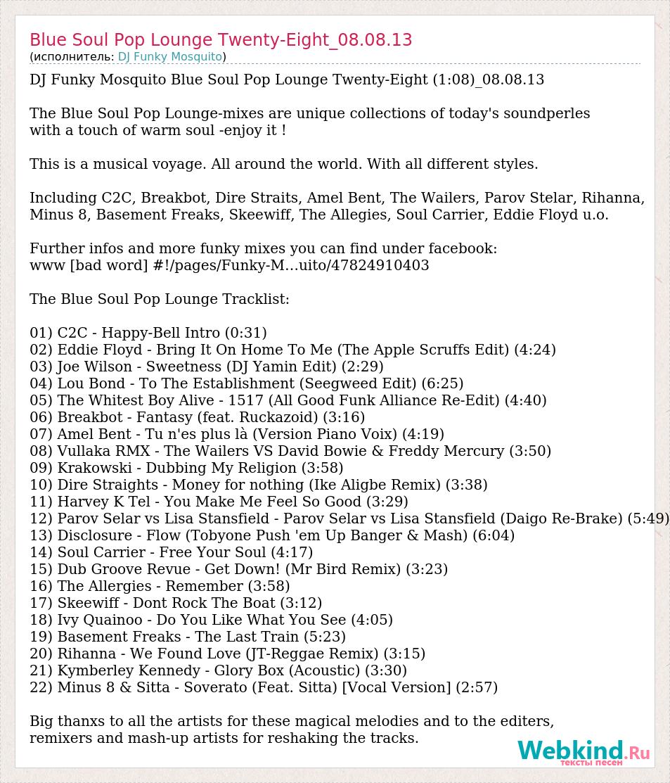 DJ Funky Mosquito Blue Soul Pop Lounge Twenty-Eight (1:08)_08.08.13 The Blue Soul Pop Lounge-mixes are unique collections of today's soundperles with a touch of warm soul -enjoy it ! This is a musical voyage. All around the world. With all different styles. Including C2C, Breakbot, Dire Straits, Amel Bent, The Wailers, Parov Stelar, Rihanna, Minus 8, Basement Freaks, Skeewiff, The Allegies, Soul Carrier, Eddie Floyd u.o. Further infos and more funky mixes you can find under facebook: www [bad word] #!/pages/Funky-M…uito/47824910403 The Blue Soul Pop Lounge Tracklist: 01) C2C - Happy-Bell Intro (0:31) 02) Eddie Floyd - Bring It On Home To Me (The Apple Scruffs Edit) (4:24) 03) Joe Wilson - Sweetness (DJ Yamin Edit) (2:29) 04) Lou Bond - To The Establishment (Seegweed Edit) (6:25) 05) The Whitest Boy Alive - 1517 (All Good Funk Alliance Re-Edit) (4:40) 06) Breakbot - Fantasy (feat. Ruckazoid) (3:16) 07) Amel Bent - Tu n'es plus là (Version Piano Voix) (4:19) 08) Vullaka RMX - The Wailers VS David Bowie & Freddy Mercury (3:50) 09) Krakowski - Dubbing My Religion (3:58) 10) Dire Straights - Money for nothing (Ike Aligbe Remix) (3:38) 11) Harvey K Tel - You Make Me Feel So Good (3:29) 12) Parov Selar vs Lisa Stansfield - Parov Selar vs Lisa Stansfield (Daigo Re-Brake) (5:49) 13) Disclosure - Flow (Tobyone Push 'em Up Banger & Mash) (6:04) 14) Soul Carrier - Free Your Soul (4:17) 15) Dub Groove Revue - Get Down! (Mr Bird Remix) (3:23) 16) The Allergies - Remember (3:58) 17) Skeewiff - Dont Rock The Boat (3:12) 18) Ivy Quainoo - Do You Like What You See (4:05) 19) Basement Freaks - The Last Train (5:23) 20) Rihanna - We Found Love (JT-Reggae Remix) (3:15) 21) Kymberley Kennedy - Glory Box (Acoustic) (3:30) 22) Minus 8 & Sitta - Soverato (Feat. Sitta) [Vocal Version] (2:57) Big thanxs to all the artists for these magical melodies and to the editers, remixers and mash-up artists for reshaking the tracks.