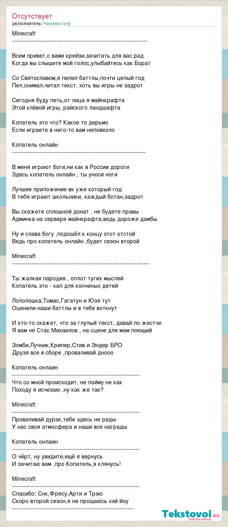 Minecraft -------------------------------------------------------------------- Всем привет,с вами крейзи,зачитать для вас рад Когда вы слышите мой голос,улыбайтесь как Борат Со Святославом,я пилил баттлы,почти целый год Пел,снимал,читал текст, хоть вы игры не задрот Сегодня буду петь,от лица я майнкрафта Этой клёвой игры, райского ландшафта Копатель это что? Какое то дерьмо Если играете в него-то вам неповезло Копатель онлайн ------------------------------------------------------------------- В меня играют боги,ни как в России дороги Здесь копатель онлайн , ты уноси ноги Лучшее приложение вк уже который год В тебя играют школьники, каждый ботан,задрот Вы скажете сплошной донат , не будете правы Админка на сервере майнкрафта,ведь дороже дамбы Ну и слава богу ,подошёл к концу этот отстой Ведь про копатель онлайн ,будет сезон второй Minecraft --------------------------------------------------------------------- Ты жалкая пародия , оплот тугих мыслей Копатель это - кал для конченых детей Лололошка,Томас,Гагатун и Юзя тут Оценили наши баттлы и в тебе воткнут И кто-то скажет, что за глупый текст, давай по жестче Я вам не Стас Михаилов , на сцене для мам поющий Зомби,Лучник,Крипер,Стив и Эндер БРО Друзя все в сборе ,проваливай днооо Копатель онлаин ---------------------------------------------------------------- Что со мной происходит, не пойму не как Походу я исчезаю ,ну как же так? Minecraft ---------------------------------------------------------------- Проваливай дурак,тебе здесь не рады У нас своя атмосфера и наши все награды Копатель онлаин ---------------------------------------------------------------- О чёрт, ну увидите,ещё я вернусь И зачитаю вам ,про Копатель,я клянусь! Minecraft ---------------------------------------------------------------- Спасибо: Снк,Фресу,Арти и Трэю Скоро второй сезон,я не прощаюсь хэй йоу -------------------------------------------------------------