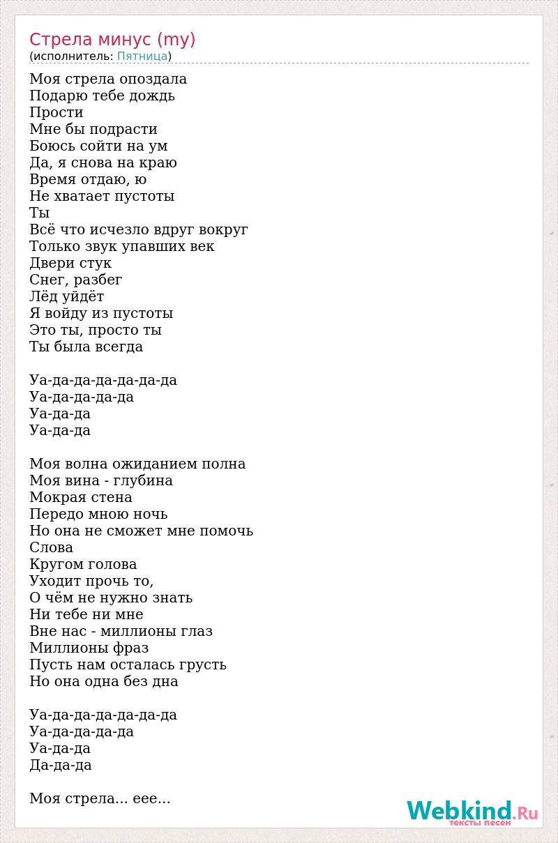 Моя стрела опоздала Подарю тебе дождь Прости Мне бы подрасти Боюсь сойти на ум Да, я снова на краю Время отдаю, ю Не хватает пустоты Ты Всё что исчезло вдруг вокруг Только звук упавших век Двери стук Снег, разбег Лёд уйдёт Я войду из пустоты Это ты, просто ты Ты была всегда Уа-да-да-да-да-да-да Уа-да-да-да-да Уа-да-да Уа-да-да Моя волна ожиданием полна Моя вина - глубина Мокрая стена Передо мною ночь Но она не сможет мне помочь Слова Кругом голова Уходит прочь то, О чём не нужно знать Ни тебе ни мне Вне нас - миллионы глаз Миллионы фраз Пусть нам осталась грусть Но она одна без дна Уа-да-да-да-да-да-да Уа-да-да-да-да Уа-да-да Да-да-да Моя стрела... еее...