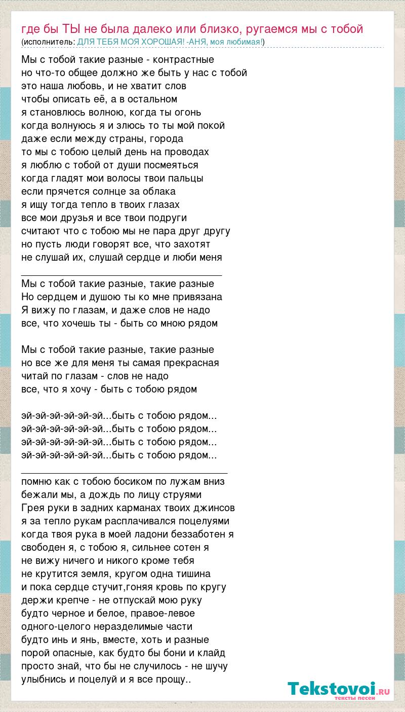 Мы с тобой такие разные - контрастные но что-то общее должно же быть у нас с тобой это наша любовь, и не хватит слов чтобы описать её, а в остальном я становлюсь волною, когда ты огонь когда волнуюсь я и злюсь то ты мой покой даже если между страны, города то мы с тобою целый день на проводах я люблю с тобой от души посмеяться когда гладят мои волосы твои пальцы если прячется солнце за облака я ищу тогда тепло в твоих глазах все мои друзья и все твои подруги считают что с тобою мы не пара друг другу но пусть люди говорят все, что захотят не слушай их, слушай сердце и люби меня ____________________________________ Мы с тобой такие разные, такие разные Но сердцем и душою ты ко мне привязана Я вижу по глазам, и даже слов не надо все, что хочешь ты - быть со мною рядом Мы с тобой такие разные, такие разные но все же для меня ты самая прекрасная читай по глазам - слов не надо все, что я хочу - быть с тобою рядом эй-эй-эй-эй-эй-эй...быть с тобою рядом... эй-эй-эй-эй-эй-эй...быть с тобою рядом... эй-эй-эй-эй-эй-эй...быть с тобою рядом... эй-эй-эй-эй-эй-эй...быть с тобою рядом... _____________________________________ помню как с тобою босиком по лужам вниз бежали мы, а дождь по лицу струями Грея руки в задних карманах твоих джинсов я за тепло рукам расплачивался поцелуями когда твоя рука в моей ладони беззаботен я свободен я, с тобою я, сильнее сотен я не вижу ничего и никого кроме тебя не крутится земля, кругом одна тишина и пока сердце стучит,гоняя кровь по кругу держи крепче - не отпускай мою руку будто черное и белое, правое-левое одного-целого неразделимые части будто инь и янь, вместе, хоть и разные порой опасные, как будто бы бони и клайд просто знай, что бы не случилось - не шучу улыбнись и поцелуй и я все прощу..