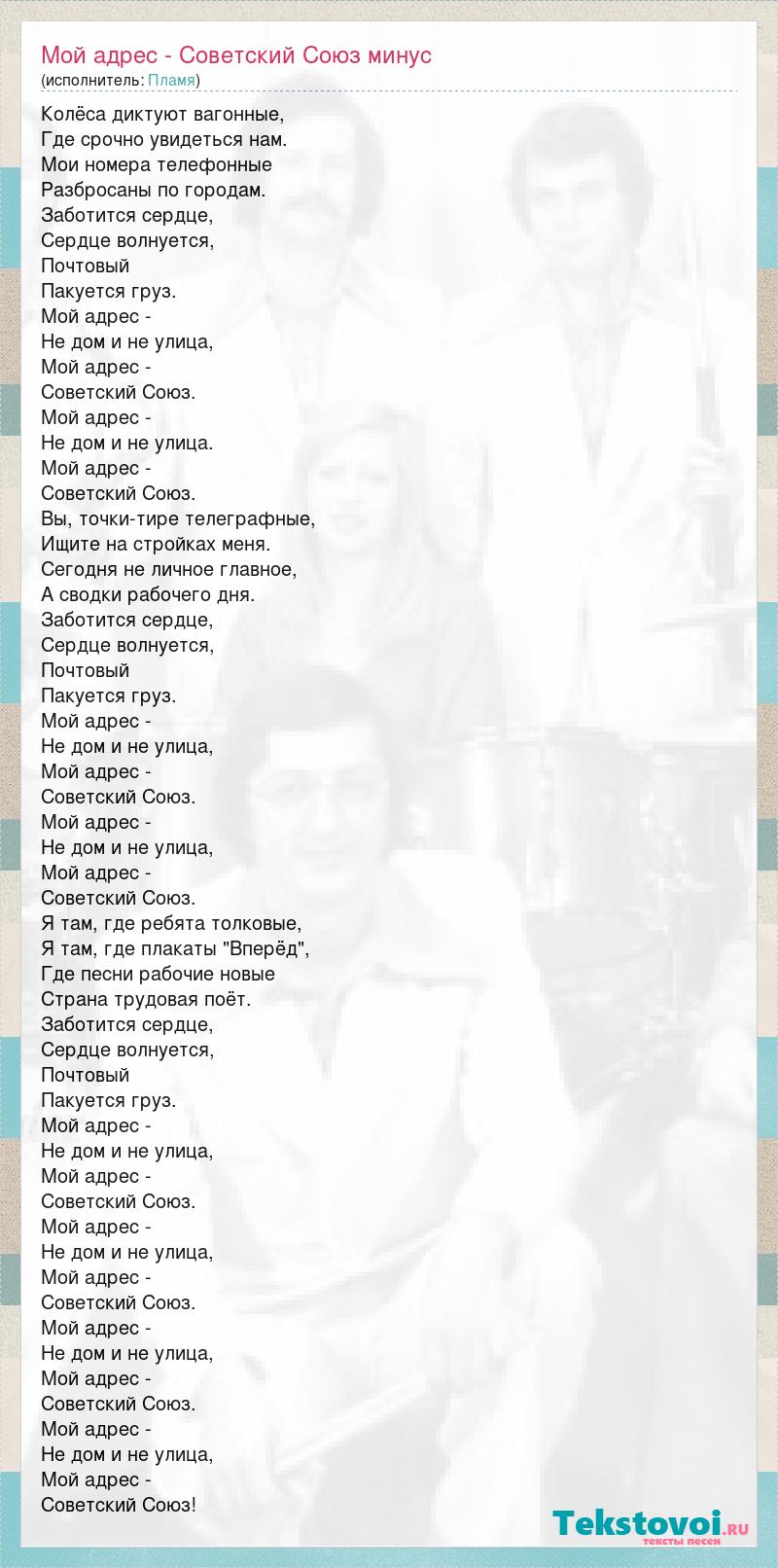 Колёса диктуют вагонные, Где срочно увидеться нам. Мои номера телефонные Разбросаны по городам. Заботится сердце, Сердце волнуется, Почтовый Пакуется груз. Мой адрес - Не дом и не улица, Мой адрес - Советский Союз. Мой адрес - Не дом и не улица. Мой адрес - Советский Союз. Вы, точки-тире телеграфные, Ищите на стройках меня. Сегодня не личное главное, А сводки рабочего дня. Заботится сердце, Сердце волнуется, Почтовый Пакуется груз. Мой адрес - Не дом и не улица, Мой адрес - Советский Союз. Мой адрес - Не дом и не улица, Мой адрес - Советский Союз. Я там, где ребята толковые, Я там, где плакаты "Вперёд", Где песни рабочие новые Страна трудовая поёт. Заботится сердце, Сердце волнуется, Почтовый Пакуется груз. Мой адрес - Не дом и не улица, Мой адрес - Советский Союз. Мой адрес - Не дом и не улица, Мой адрес - Советский Союз. Мой адрес - Не дом и не улица, Мой адрес - Советский Союз. Мой адрес - Не дом и не улица, Мой адрес - Советский Союз!