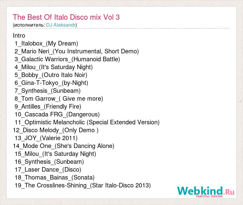 Intro 1_Italobox_(My Dream) 2_Mario Neri_(You Instrumental, Short Demo) 3_Galactic Warriors_(Humanoid Battle) 4_Milou_(It's Saturday Night) 5_Bobby_(Outro Italo Noir) 6_Gina-T-Tokyo_(by-Night) 7_Synthesis_(Sunbeam) 8_Tom Garrow_( Give me more) 9_Antilles_(Friendly Fire) 10_Cascada FRG_(Dangerous) 11_Optimistic Melancholic (Special Extended Version) 12_Disco Melody_(Only Demo ) 13_JOY_(Valerie 2011) 14_Mode One_(She's Dancing Alone) 15_Milou_(It's Saturday Night) 16_Synthesis_(Sunbeam) 17_Laser Dance_(Disco) 18_Thomas_Bainas_(Sonata) 19_The Crosslines-Shining_(Star Italo-Disco 2013)