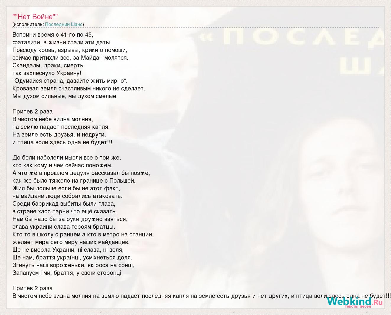 Вспомни время с 41-го по 45, фаталити, в жизни стали эти даты. Повсюду кровь, взрывы, крики о помощи, сейчас притихли все, за Майдан молятся. Скандалы, драки, смерть так захлеснуло Украину! "Одумайся страна, давайте жить мирно". Кровавая земля счастливым никого не сделает. Мы духом сильные, мы духом смелые. Припев 2 раза В чистом небе видна молния, на землю падает последняя капля. На земле есть друзья, и недруги, и птица воли здесь одна не будет!!! До боли наболели мысли все о том же, кто как кому и чем сейчас поможем. А что же в прошлом дедуля рассказал бы позже, как же было тяжело на границе с Польшей. Жил бы дольше если бы не этот факт, на майдане люди собрались атаковать. Среди баррикад выбиты были глаза, в стране хаос парни что ещё сказать. Нам бы надо бы за руки дружно взяться, слава украини слава героям братцы. Кто то в школу с ранцем а кто в метро на станции, желает мира сего миру наших майданцев. Ще не вмерла України, ні слава, ні воля, Ще нам, браття українці, усміхнеться доля. Згинуть наші вороженьки, як роса на сонці, Запануєм і ми, браття, у своїй сторонці Припев 2 раза В чистом небе видна молния на землю падает последняя капля на земле есть друзья и нет других, и птица воли здесь одна не будет!!!