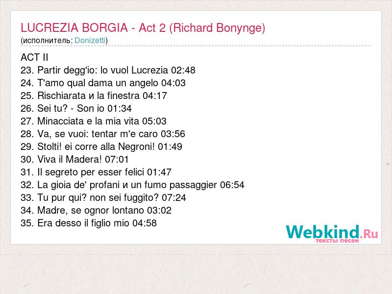 ACT II 23. Partir degg'io: lo vuol Lucrezia 02:48 24. T'amo qual dama un angelo 04:03 25. Rischiarata и la finestra 04:17 26. Sei tu? - Son io 01:34 27. Minacciata e la mia vita 05:03 28. Va, se vuoi: tentar m'e caro 03:56 29. Stolti! ei corre alla Negroni! 01:49 30. Viva il Madera! 07:01 31. Il segreto per esser felici 01:47 32. La gioia de' profani и un fumo passaggier 06:54 33. Tu pur qui? non sei fuggito? 07:24 34. Madre, se ognor lontano 03:02 35. Era desso il figlio mio 04:58
