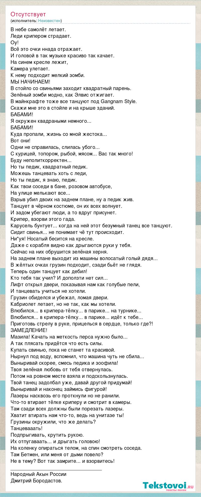 В небе самолёт летает. Леди крипером страдает. Оу! Всё это очки ннада отражает. И головой в так музыке красиво так качает. На синем кресле лежит, Камера улетает. К нему подходит мелкий зомби. МЫ НАЧИНАЕМ! В стойло со свиньями заходит квадратный парень. Зелёный зомби модно, как Элвис отжигает. В майнкрафте тоже все танцуют под Gangnam Style. Скажи мне это в стойле и на крыше зданий. БАБАМИ! Я окружен квадраными немного... БАБАМИ! Куда пропали, жизнь со мной жестока... Вот они! Одни не справилась, слилась убого... С курицей, топором, рыбой, мясом... Вас так много! Буду неполиткорректен... Но ты педик, квадратный педик. Можешь танцевать хоть с леди, Но ты педик, я знаю, педик. Как твои соседи в бане, розовом автобусе, На улице мелькают все... Взрыв убил двоих на заднем плане, ну а педик жив. Танцует в чёрном костюме, он их всех волнует. И задом убегают люди, а то вдруг присунет. Крипер, взорви этого гада. Карусель бунтует... когда на ней этот безумный танец все танцуют. Сидит свинья... не понимает чё тут происходит. Ни*уя! Носатый бесится на кресле. Даже с корабля видно как дрыгаются руки у тебя. Сейчас на них обрушится зелёная херня. На заднем плане выходит из машины волосатый голый дядя... В жёлтых очках грузин подходит, сзади бьёт не глядя. Теперь один танцует как дебил! Кто тебя так учил? И доползти нет сил... Лифт открыл двери, показывая нам как голубые пели, И танцевать учиться не хотели. Грузин обиделся и убежал, ломая двери. Кабриолет летает, но не так, как мы хотели. Влюбился... в крипера-тёлку... в парике... на турнике... Влюбился... в крипера-тёлку... в парике... идёт к тебе... Приготовь стрелу в руке, прицелься в сердце, только где?! ЗАМЕДЛЕНИЕ! Мазила! Качать на меткость перса нужно было... А так плясать придётся что есть силы. Купать свинью, пока не станет та красивой. Нырнул под воду, вспомнил, что машина чуть не сбила... Выныривай скорее, смесь педика и зоофила! Твоя зелёная любовь от тебя отвернулась. Потом на ровном месте взяла и подскользнулась. Твой танец задолбал уже, давай другой придумай! Выныривай и наконец займись фигурой! Лазеры насквозь его проткнули но не ранили. Что-то втирает тёлке криперу и смотрит в камеры. Там сзади всех должны были порезать лазеры. Хватит втирать нам что-то, ведь на унитазе ты! Грузины окружили, что же делать? Танцевааать! Подпрыгивать, крутить рукою. Их отпугаваать... и дрыгать головою! На коленку опираться телом, на спин смотреть соседа. Там Бетмен, или меня от дыми повело? Не в тему? Вот так замрите... и взорвитесь! _________________________________ Народный Акын России Дмитрий Бородастов.