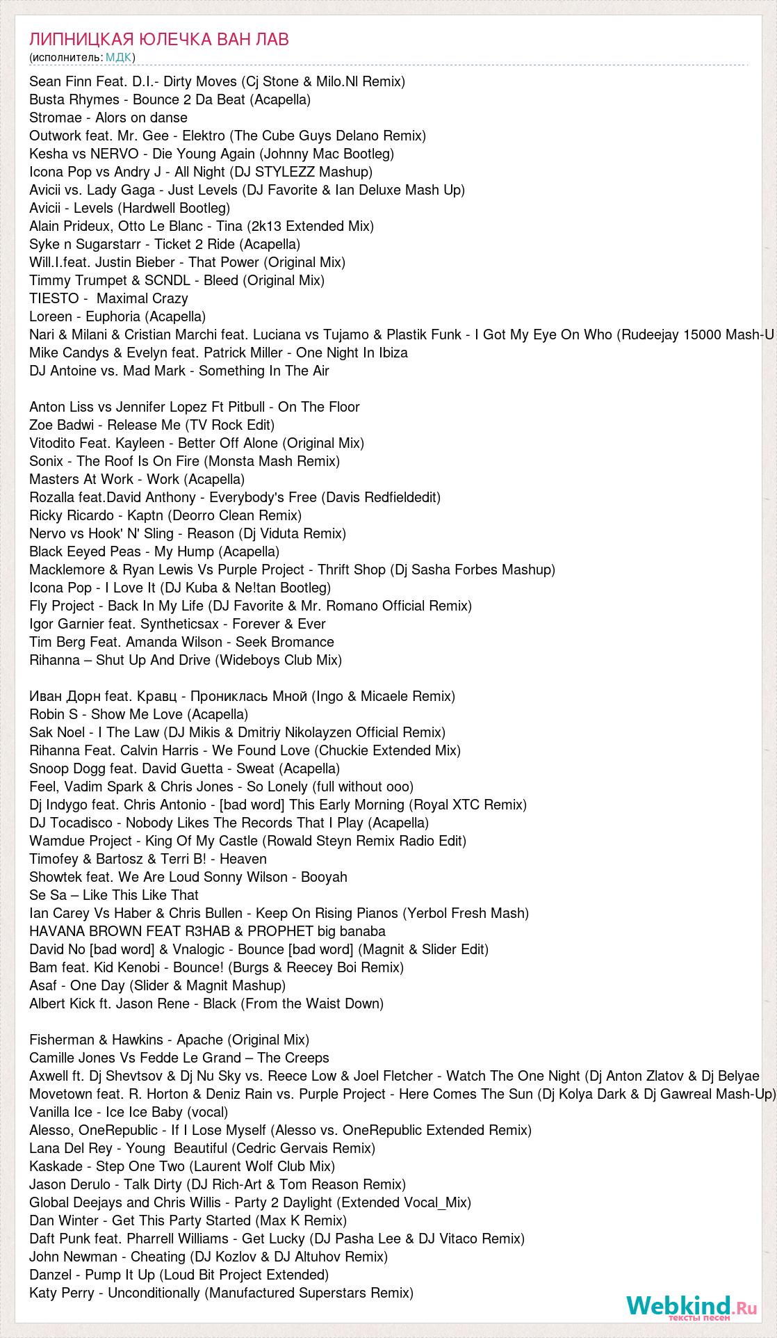 Sean Finn Feat. D.I.- Dirty Moves (Cj Stone & Milo.Nl Remix) Busta Rhymes - Bounce 2 Da Beat (Acapella) Stromae - Alors on danse Outwork feat. Mr. Gee - Elektro (The Cube Guys Delano Remix) Kesha vs NERVO - Die Young Again (Johnny Mac Bootleg) Icona Pop vs Andry J - All Night (DJ STYLEZZ Mashup) Avicii vs. Lady Gaga - Just Levels (DJ Favorite & Ian Deluxe Mash Up) Avicii - Levels (Hardwell Bootleg) Alain Prideux, Otto Le Blanc - Tina (2k13 Extended Mix) Syke n Sugarstarr - Ticket 2 Ride (Acapella) Will.I.feat. Justin Bieber - That Power (Original Mix) Timmy Trumpet & SCNDL - Bleed (Original Mix) TIESTO - Maximal Crazy Loreen - Euphoria (Acapella) Nari & Milani & Cristian Marchi feat. Luciana vs Tujamo & Plastik Funk - I Got My Eye On Who (Rudeejay 15000 Mash-U Mike Candys & Evelyn feat. Patrick Miller - One Night In Ibiza DJ Antoine vs. Mad Mark - Something In The Air Anton Liss vs Jennifer Lopez Ft Pitbull - On The Floor Zoe Badwi - Release Me (TV Rock Edit) Vitodito Feat. Kayleen - Better Off Alone (Original Mix) Sonix - The Roof Is On Fire (Monsta Mash Remix) Masters At Work - Work (Acapella) Rozalla feat.David Anthony - Everybody's Free (Davis Redfieldedit) Ricky Ricardo - Kaptn (Deorro Clean Remix) Nervo vs Hook' N' Sling - Reason (Dj Viduta Remix) Black Eeyed Peas - My Hump (Acapella) Macklemore & Ryan Lewis Vs Purple Project - Thrift Shop (Dj Sasha Forbes Mashup) Icona Pop - I Love It (DJ Kuba & Ne!tan Bootleg) Fly Project - Back In My Life (DJ Favorite & Mr. Romano Official Remix) Igor Garnier feat. Syntheticsax - Forever & Ever Tim Berg Feat. Amanda Wilson - Seek Bromance Rihanna – Shut Up And Drive (Wideboys Club Mix) Иван Дорн feat. Кравц - Прониклась Мной (Ingo & Micaele Remix) Robin S - Show Me Love (Acapella) Sak Noel - I The Law (DJ Mikis & Dmitriy Nikolayzen Official Remix) Rihanna Feat. Calvin Harris - We Found Love (Chuckie Extended Mix) Snoop Dogg feat. David Guetta - Sweat (Acapella) Feel, Vadim Spark & Chris Jones - So Lonely (full without ooo) Dj Indygo feat. Chris Antonio - [bad word] This Early Morning (Royal XTC Remix) DJ Tocadisco - Nobody Likes The Records That I Play (Acapella) Wamdue Project - King Of My Castle (Rowald Steyn Remix Radio Edit) Timofey & Bartosz & Terri B! - Heaven Showtek feat. We Are Loud Sonny Wilson - Booyah Se Sa – Like This Like That Ian Carey Vs Haber & Chris Bullen - Keep On Rising Pianos (Yerbol Fresh Mash) HAVANA BROWN FEAT R3HAB & PROPHET big banaba David No [bad word] & Vnalogic - Bounce [bad word] (Magnit & Slider Edit) Bam feat. Kid Kenobi - Bounce! (Burgs & Reecey Boi Remix) Asaf - One Day (Slider & Magnit Mashup) Albert Kick ft. Jason Rene - Black (From the Waist Down) Fisherman & Hawkins - Apache (Original Mix) Camille Jones Vs Fedde Le Grand – The Creeps Axwell ft. Dj Shevtsov & Dj Nu Sky vs. Reece Low & Joel Fletcher - Watch The One Night (Dj Anton Zlatov & Dj Belyae Movetown feat. R. Horton & Deniz Rain vs. Purple Project - Here Comes The Sun (Dj Kolya Dark & Dj Gawreal Mash-Up) Vanilla Ice - Ice Ice Baby (vocal) Alesso, OneRepublic - If I Lose Myself (Alesso vs. OneRepublic Extended Remix) Lana Del Rey - Young Beautiful (Cedric Gervais Remix) Kaskade - Step One Two (Laurent Wolf Club Mix) Jason Derulo - Talk Dirty (DJ Rich-Art & Tom Reason Remix) Global Deejays and Chris Willis - Party 2 Daylight (Extended Vocal_Mix) Dan Winter - Get This Party Started (Max K Remix) Daft Punk feat. Pharrell Williams - Get Lucky (DJ Pasha Lee & DJ Vitaco Remix) John Newman - Cheating (DJ Kozlov & DJ Altuhov Remix) Danzel - Pump It Up (Loud Bit Project Extended) Katy Perry - Unconditionally (Manufactured Superstars Remix)