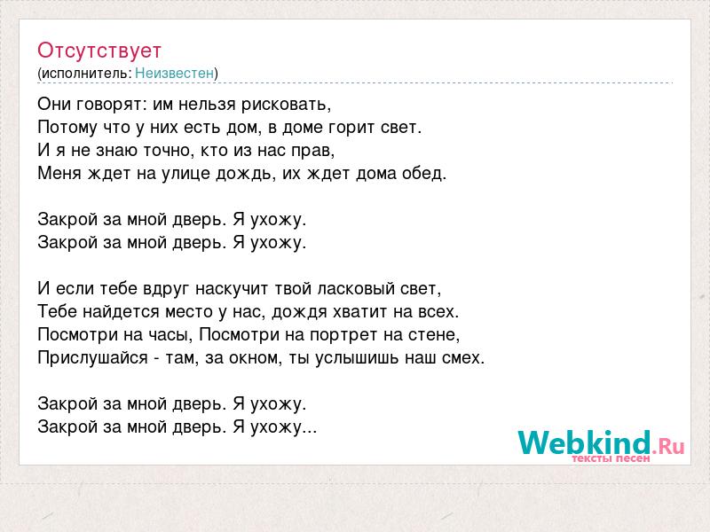 Они говорят: им нельзя рисковать, Потому что у них есть дом, в доме горит свет. И я не знаю точно, кто из нас прав, Меня ждет на улице дождь, их ждет дома обед. Закрой за мной дверь. Я ухожу. Закрой за мной дверь. Я ухожу. И если тебе вдруг наскучит твой ласковый свет, Тебе найдется место у нас, дождя хватит на всех. Посмотри на часы, Посмотри на портрет на стене, Прислушайся - там, за окном, ты услышишь наш смех. Закрой за мной дверь. Я ухожу. Закрой за мной дверь. Я ухожу...