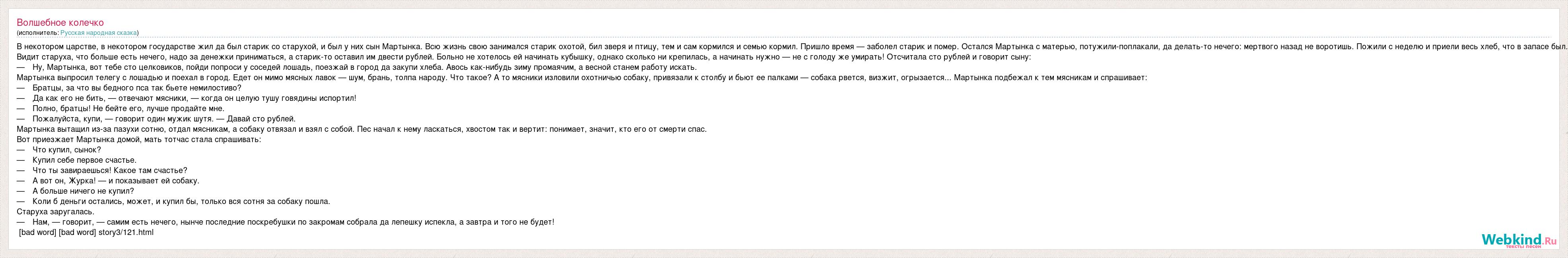 В некотором царстве, в некотором государстве жил да был старик со старухой, и был у них сын Мартынка. Всю жизнь свою занимался старик охотой, бил зверя и птицу, тем и сам кормился и семью кормил. Пришло время — заболел старик и помер. Остался Мартынка с матерью, потужили-поплакали, да делать-то нечего: мертвого назад не воротишь. Пожили с неделю и приели весь хлеб, что в запасе был. Видит старуха, что больше есть нечего, надо за денежки приниматься, а старик-то оставил им двести рублей. Больно не хотелось ей начинать кубышку, однако сколько ни крепилась, а начинать нужно — не с голоду же умирать! Отсчитала сто рублей и говорит сыну: — Ну, Мартынка, вот тебе сто целковиков, пойди попроси у соседей лошадь, поезжай в город да закупи хлеба. Авось как-нибудь зиму промаячим, а весной станем работу искать. Мартынка выпросил телегу с лошадью и поехал в город. Едет он мимо мясных лавок — шум, брань, толпа народу. Что такое? А то мясники изловили охотничью собаку, привязали к столбу и бьют ее палками — собака рвется, визжит, огрызается... Мартынка подбежал к тем мясникам и спрашивает: — Братцы, за что вы бедного пса так бьете немилостиво? — Да как его не бить, — отвечают мясники, — когда он целую тушу говядины испортил! — Полно, братцы! Не бейте его, лучше продайте мне. — Пожалуйста, купи, — говорит один мужик шутя. — Давай сто рублей. Мартынка вытащил из-за пазухи сотню, отдал мясникам, а собаку отвязал и взял с собой. Пес начал к нему ласкаться, хвостом так и вертит: понимает, значит, кто его от смерти спас. Вот приезжает Мартынка домой, мать тотчас стала спрашивать: — Что купил, сынок? — Купил себе первое счастье. — Что ты завираешься! Какое там счастье? — А вот он, Журка! — и показывает ей собаку. — А больше ничего не купил? — Коли б деньги остались, может, и купил бы, только вся сотня за собаку пошла. Старуха заругалась. — Нам, — говорит, — самим есть нечего, нынче последние поскребушки по закромам собрала да лепешку испекла, а завтра и того не будет! [bad word] [bad word] story3/121.html