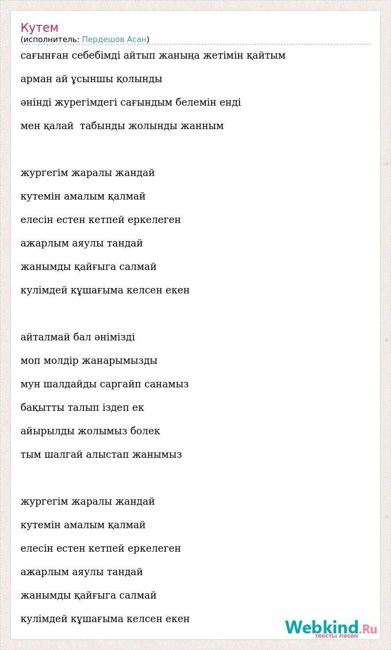 сағынған себебімді айтып жаныңа жетімін қайтым арман ай ұсыншы қолынды әнінді журегімдегі сағындым белемін енді мен қалай табынды жолынды жанным жургегім жаралы жандай кутемін амалым қалмай елесін естен кетпей еркелеген ажарлым аяулы тандай жанымды қайғыга салмай кулімдей кұшағыма келсен екен айталмай бал әнімізді моп молдір жанарымызды мун шалдайды саргайп санамыз бақытты талып іздеп ек айырылды жолымыз болек тым шалгай алыстап жанымыз жургегім жаралы жандай кутемін амалым қалмай елесін естен кетпей еркелеген ажарлым аяулы тандай жанымды қайғыга салмай кулімдей кұшағыма келсен екен