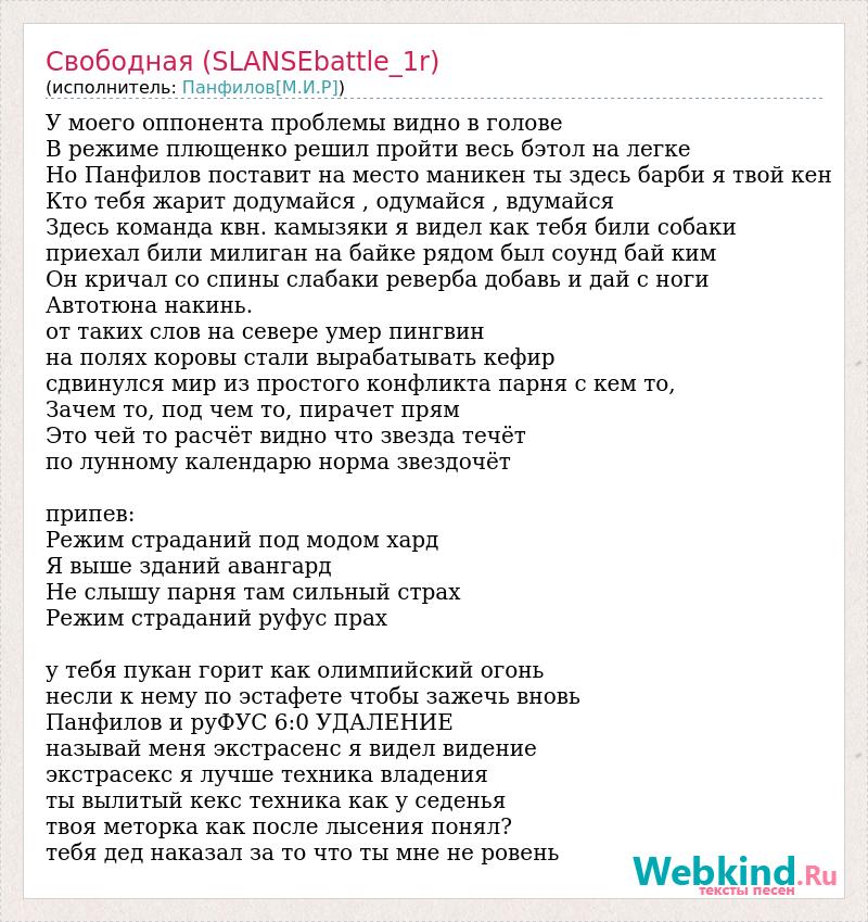 У моего оппонента проблемы видно в голове В режиме плющенко решил пройти весь бэтол на легке Но Панфилов поставит на место маникен ты здесь барби я твой кен Кто тебя жарит додумайся , одумайся , вдумайся Здесь команда квн. камызяки я видел как тебя били собаки приехал били милиган на байке рядом был соунд бай ким Он кричал со спины слабаки реверба добавь и дай с ноги Автотюна накинь. от таких слов на севере умер пингвин на полях коровы стали вырабатывать кефир сдвинулся мир из простого конфликта парня с кем то, Зачем то, под чем то, пирачет прям Это чей то расчёт видно что звезда течёт по лунному календарю норма звездочёт припев: Режим страданий под модом хард Я выше зданий авангард Не слышу парня там сильный страх Режим страданий руфус прах у тебя пукан горит как олимпийский огонь несли к нему по эстафете чтобы зажечь вновь Панфилов и руФУС 6:0 УДАЛЕНИЕ называй меня экстрасенс я видел видение экстрасекс я лучше техника владения ты вылитый кекс техника как у седенья твоя меторка как после лысения понял? тебя дед наказал за то что ты мне не ровень