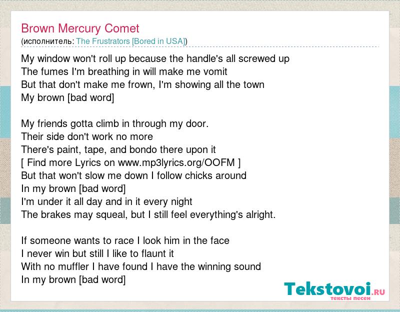 My window won't roll up because the handle's all screwed up The fumes I'm breathing in will make me vomit But that don't make me frown, I'm showing all the town My brown Mercury Comet. My friends gotta climb in through my door. Their side don't work no more There's paint, tape, and bondo there upon it [ Find more Lyrics on www.mp3lyrics.org/OOFM ] But that won't slow me down I follow chicks around In my brown Mercury Comet I'm under it all day and in it every night The brakes may squeal, but I still feel everything's alright. If someone wants to race I look him in the face I never win but still I like to flaunt it With no muffler I have found I have the winning sound In my brown Mercury Comet