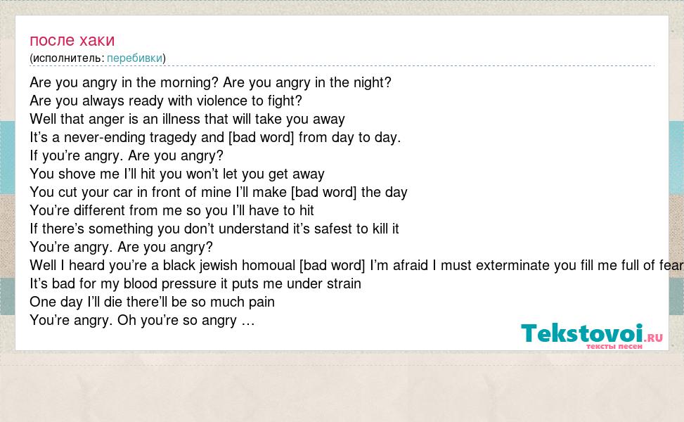 Are you angry in the morning? Are you angry in the night? Are you always ready with violence to fight? Well that anger is an illness that will take you away It’s a never-ending tragedy and it runs from day to day. If you’re angry. Are you angry? You shove me I’ll hit you won’t let you get away You cut your car in front of mine I’ll make you rue the day You’re different from me so you I’ll have to hit If there’s something you don’t understand it’s safest to kill it You’re angry. Are you angry? Well I heard you’re a black jewish homoual [bad word] I’m afraid I must exterminate you fill me full of fear It’s bad for my blood pressure it puts me under strain One day I’ll die there’ll be so much pain You’re angry. Oh you’re so angry …